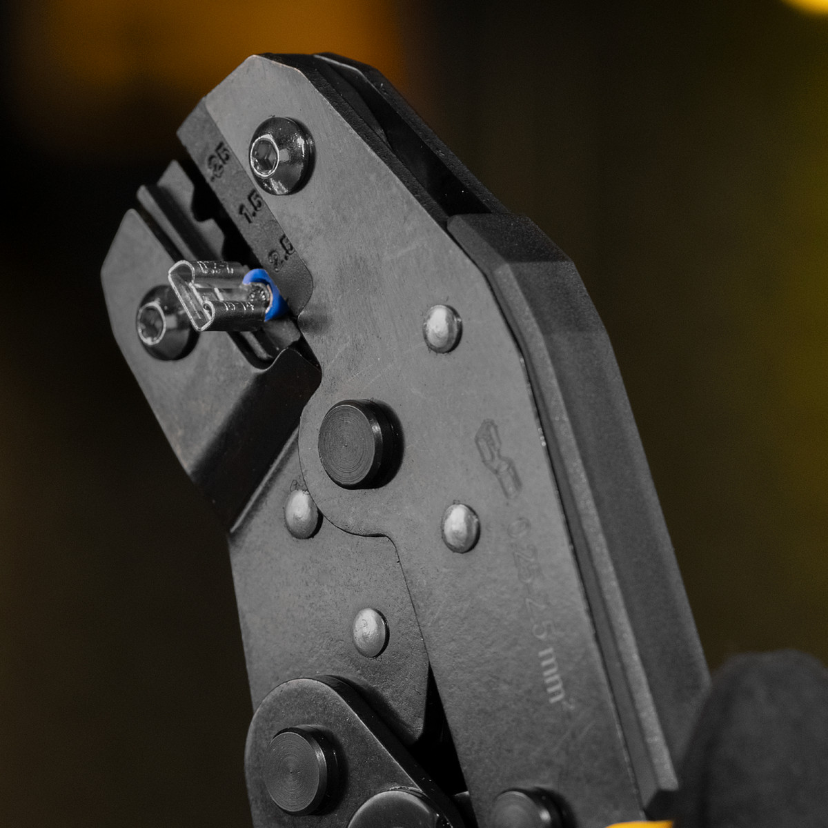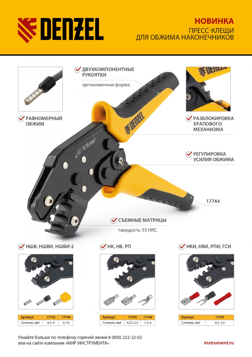 Клещи Denzel 17745 предназначены для обжима неизолированных наконечников кольцевых НК и вилочных НВ, разъемов плоских РП сечением 0,25-2,5 мм². Инструмент пригодится частным и профессиональным мастерам при проведении электромонтажных работ.
