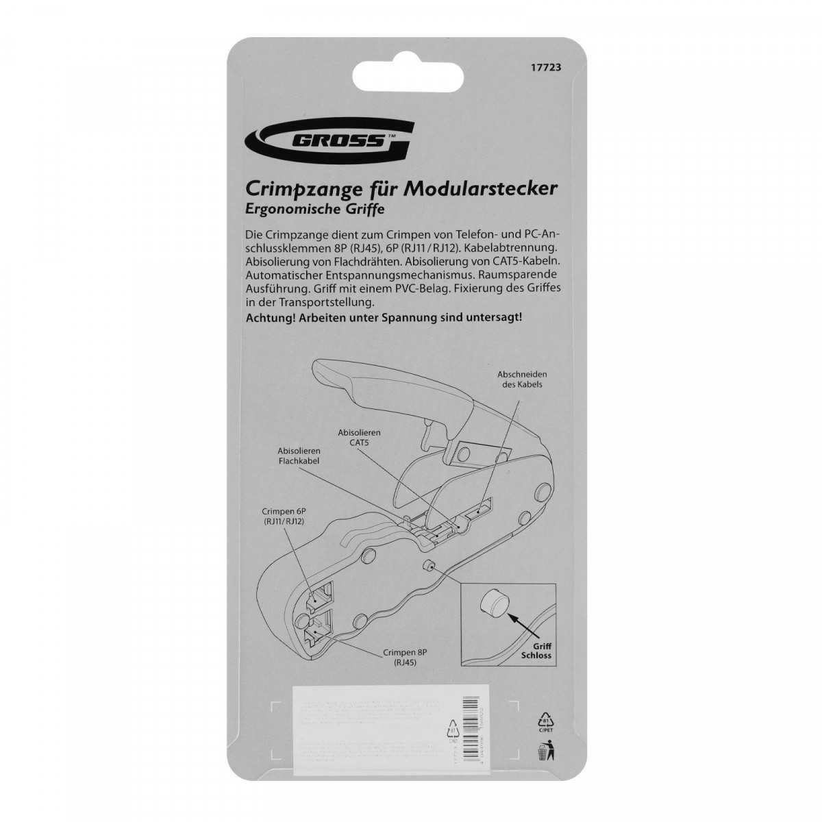 Компактные клещи Gross 17723 предназначены для обжима телефонных и компьютерных клемм наиболее популярных типоразмеров RJ45, 8P и RJ11/12, 6P, а также для зачистки кабеля CAT5. Пригодятся частным мастерам и профессионалам для подключения компьютеров и телефонов к сети.