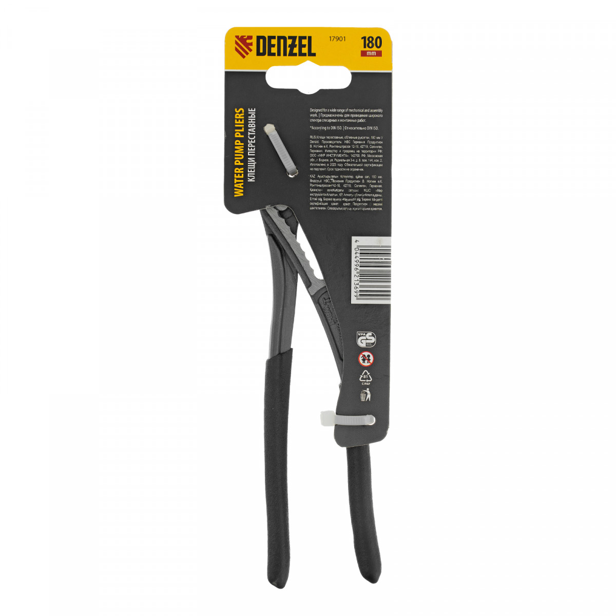 Переставные клещи Denzel 17901 длиной 180 мм, с обливными рукоятками, предназначены для фиксации и вращения деталей и заготовок различной формы. Подходят для захвата фитингов, труб, крепежных элементов. Инструмент используется при проведении ремонтных, монтажных, сантехнических работ.