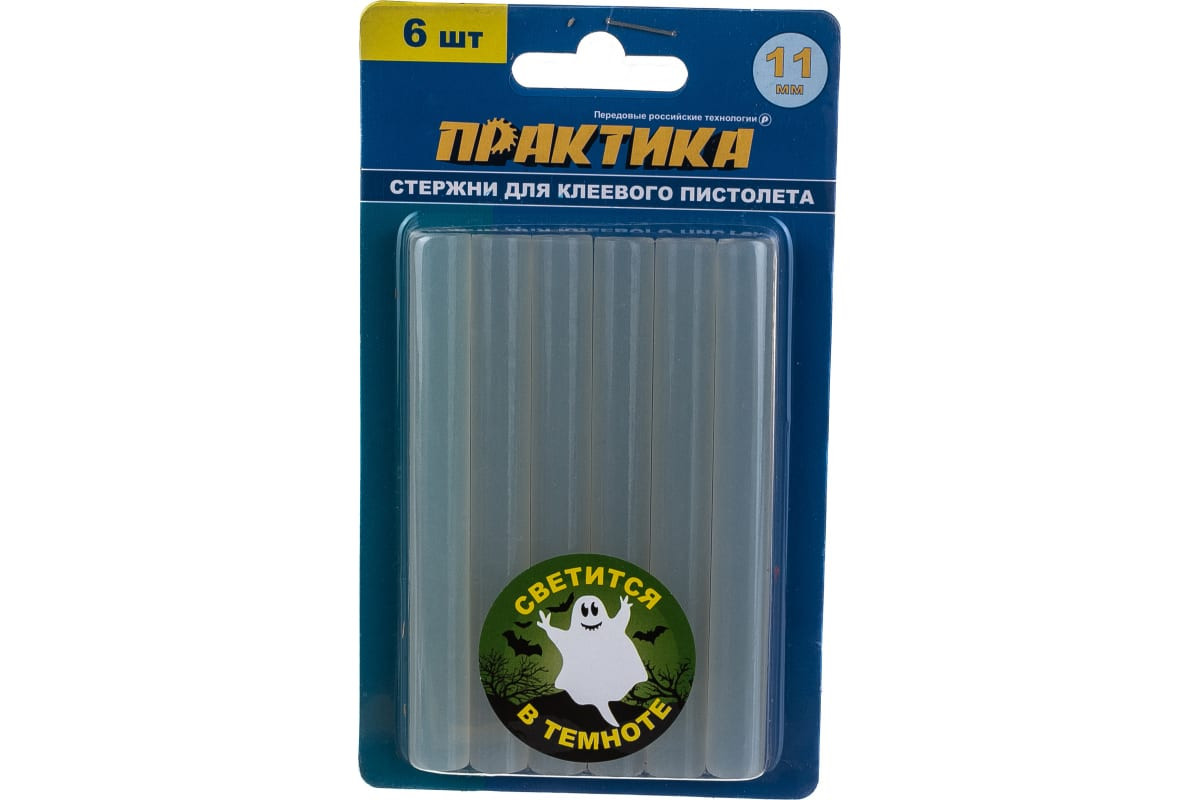 - Клей белый светящийся в темноте ( для клеевого пистолета ПРАКТИКА 790-243 предназначен для прочного соединения деталей из картона, полимерных материалов,