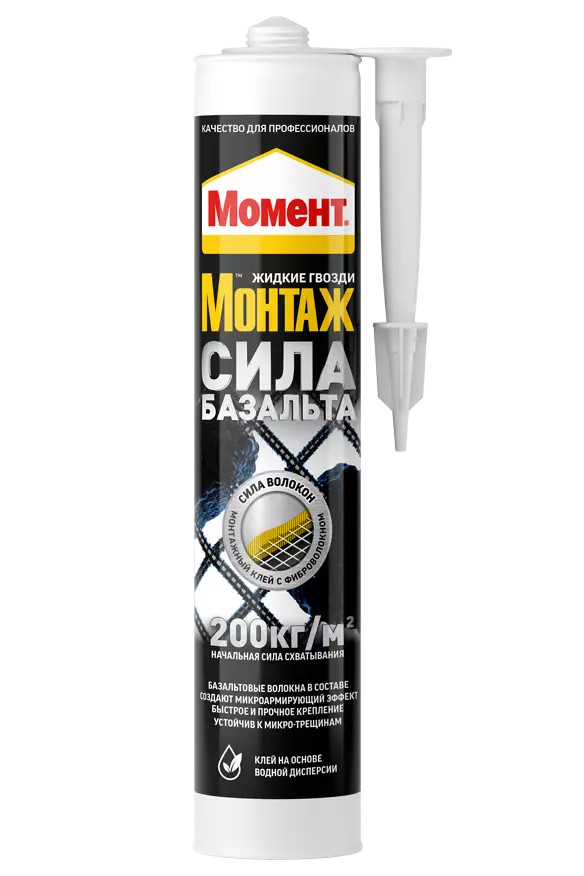 Монтажный клей Момент Монтаж Сила Базальта благодаря базальтовым волокнам в составе создает сильнейшее соединение склеиваемых элементов. Базальтовые волокна распределяются внутри клеевого шва и создают эффект микроармирующей сетки.