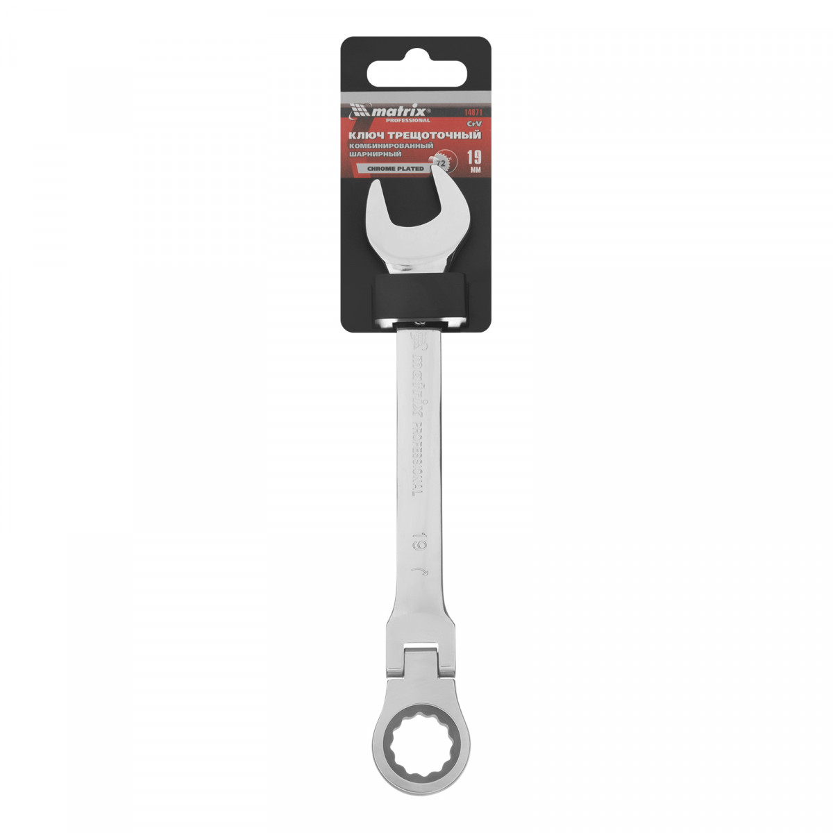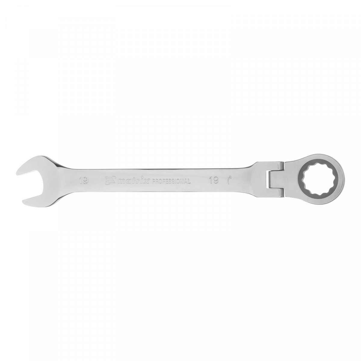 Ключ комбинированный трещоточный, 19 мм, CrV, шарнирный, зеркальный хром Matrix Professional