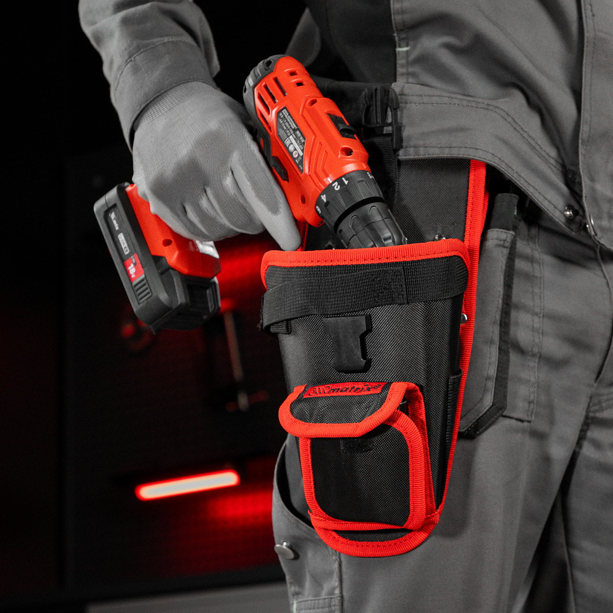 • Специальная петля обеспечивает надежную фиксацию шуруповерта, предотвращая его выскальзывание.