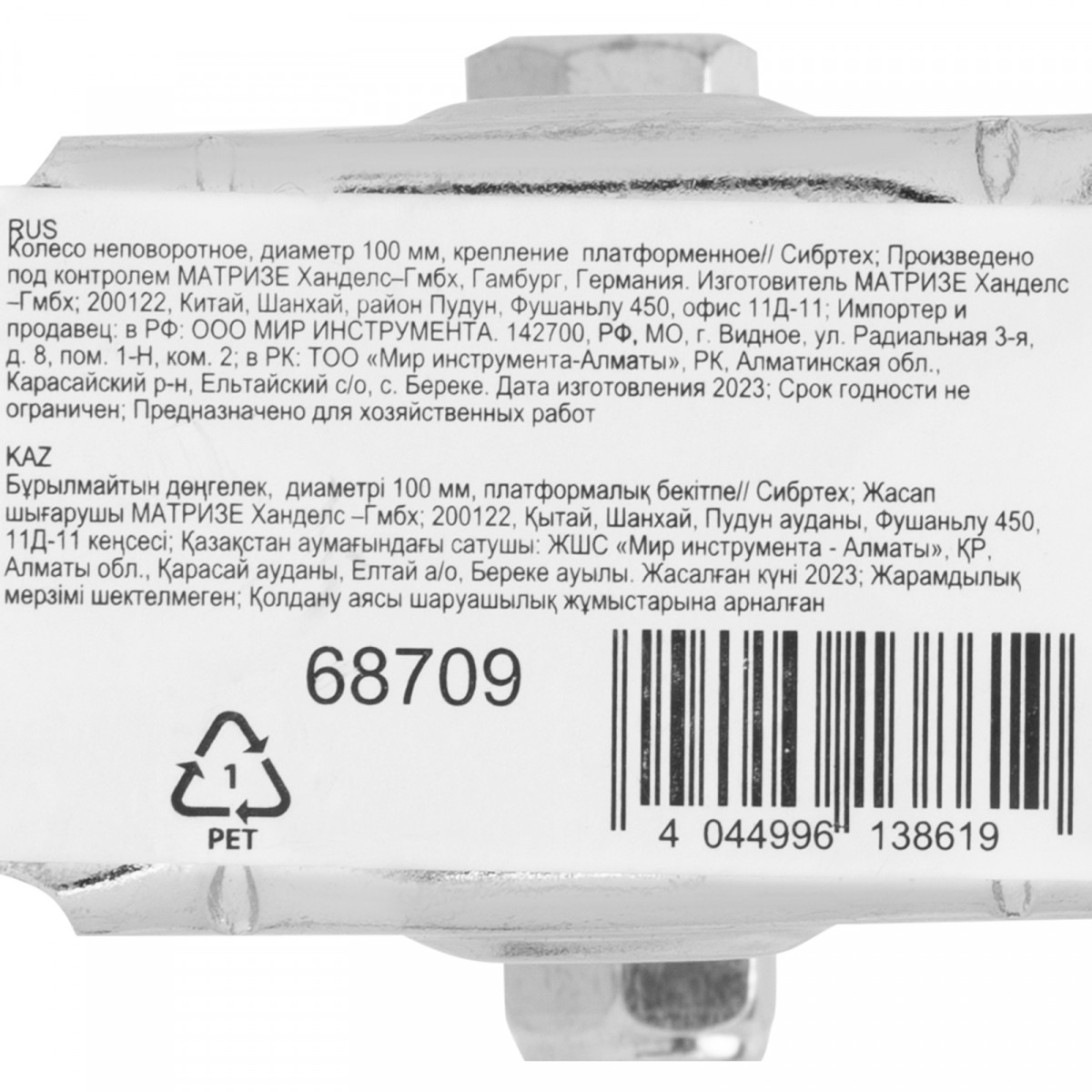Колесо неповоротное D 100 мм, крепление платформенное Сибртех