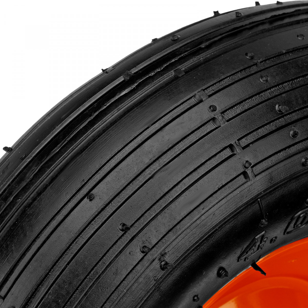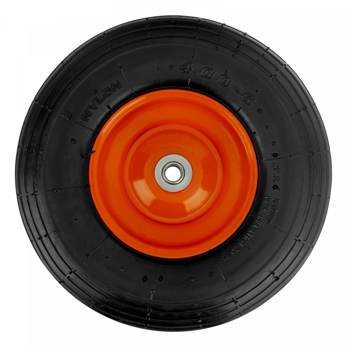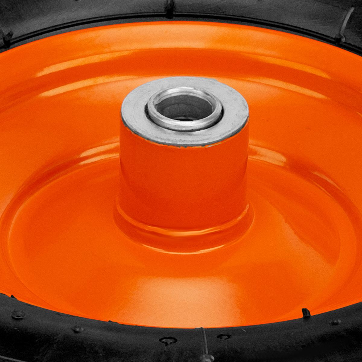 - Комфортная работа — пневматическое колесо эффективно поглощает вибрации даже при полной загрузке тачки.