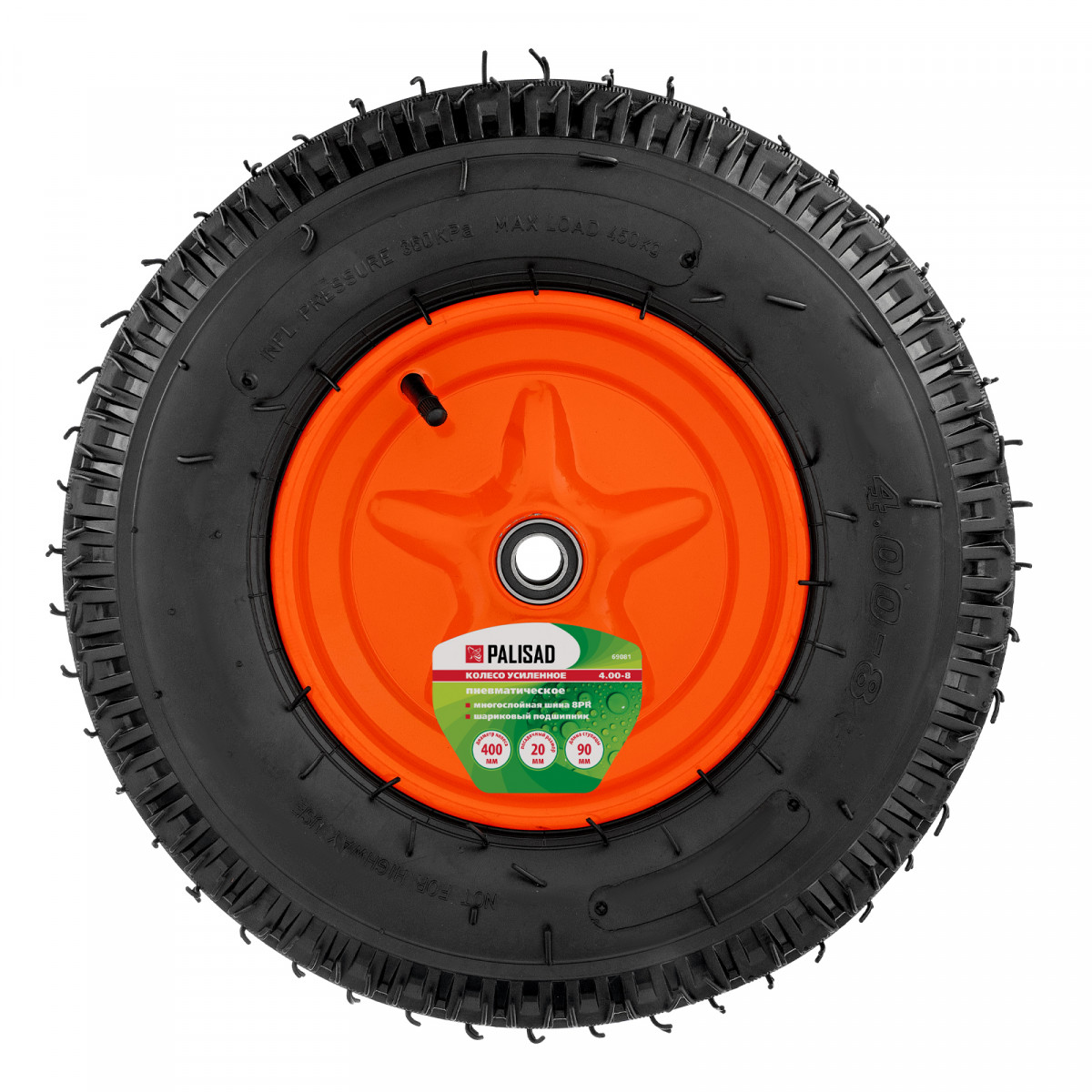 Пневматическое колесо 4.00-8 Palisad 69081 диаметром 400 мм, с усиленной шиной 8PR, на подшипниках, с длиной оси 90 мм и посадочным диаметром 20 мм, устанавливается на тачки для перемещения грузов, например, Palisad 68923, 689233, 68937, Сибртех 689643. Усиленная восьмислойная шина подходит как для садовых, так и для строительных тачек. Стальные шариковые подшипники обеспечивают плавный ход и возможность передвижения по неровной поверхности.
