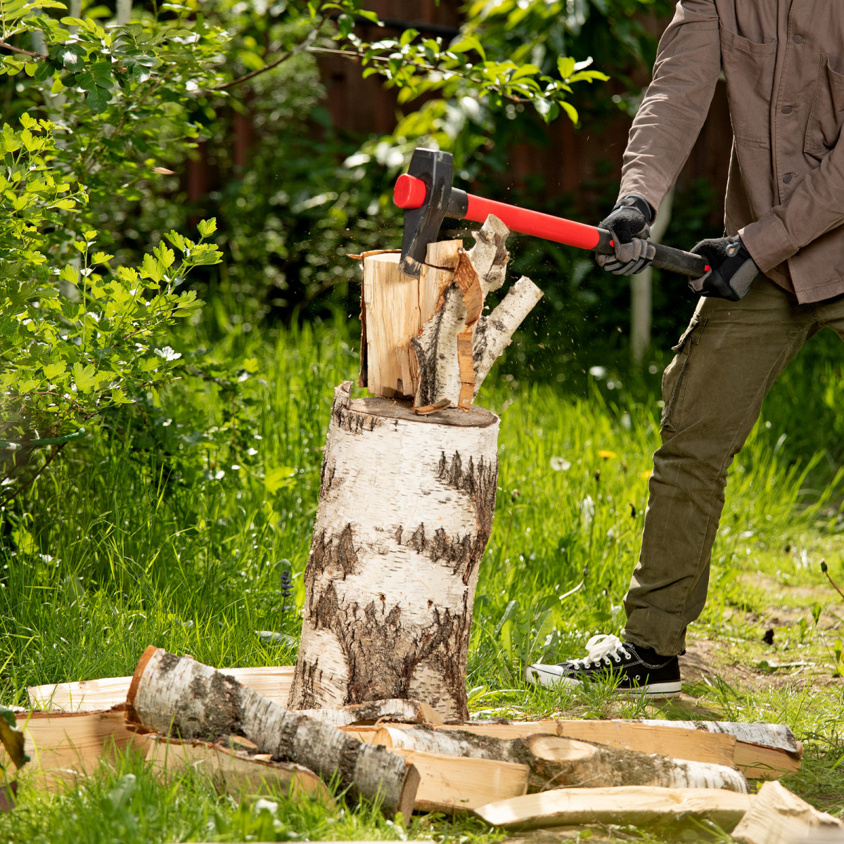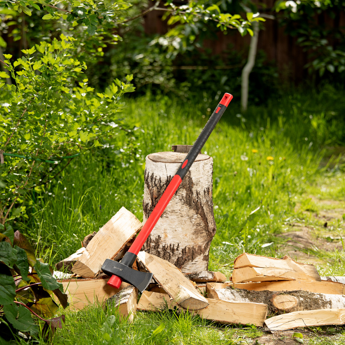 • Большая сила удара — колун оснащен длинной рукояткой 900 мм, полотно весит 2,7 кг.