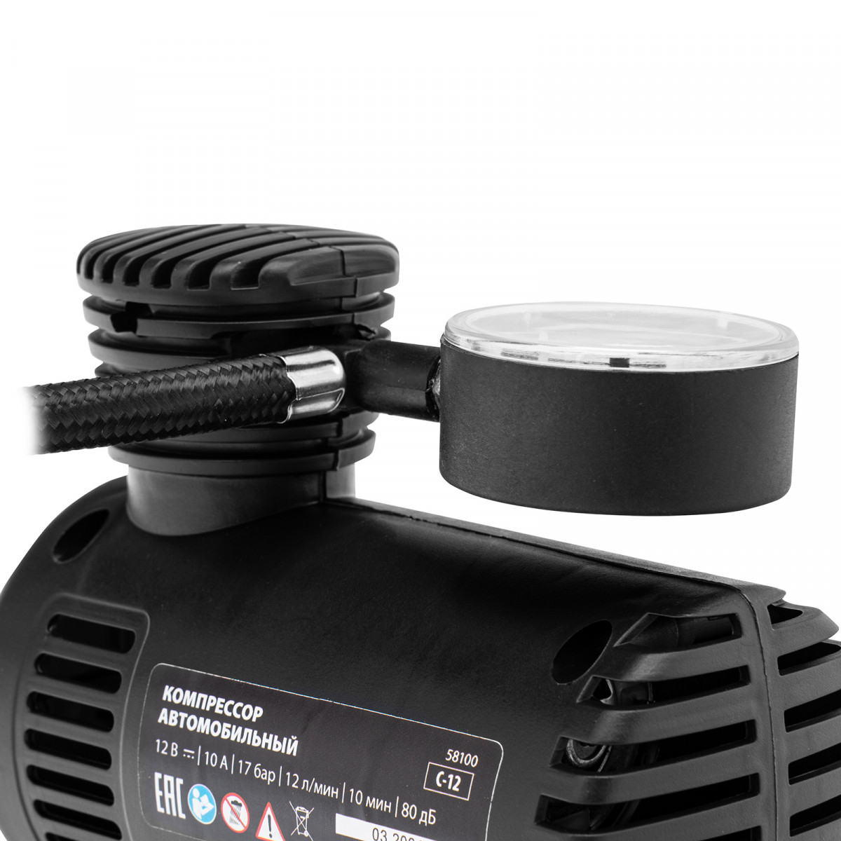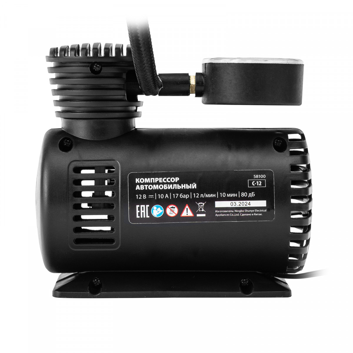 Автомобильный компрессор MTX C-12 58100 производительностью 12 л/мин обеспечивает давление до 17 атмосфер и питается от прикуривателя 12 В. Используется для накачки шин, а также мячей, матрасов, лодок и другого инвентаря. Компрессор поршневого типа способен накачать колесо R16 за 10 минут. Устройство пригодится в поездке, на даче, во время отдыха на природе.