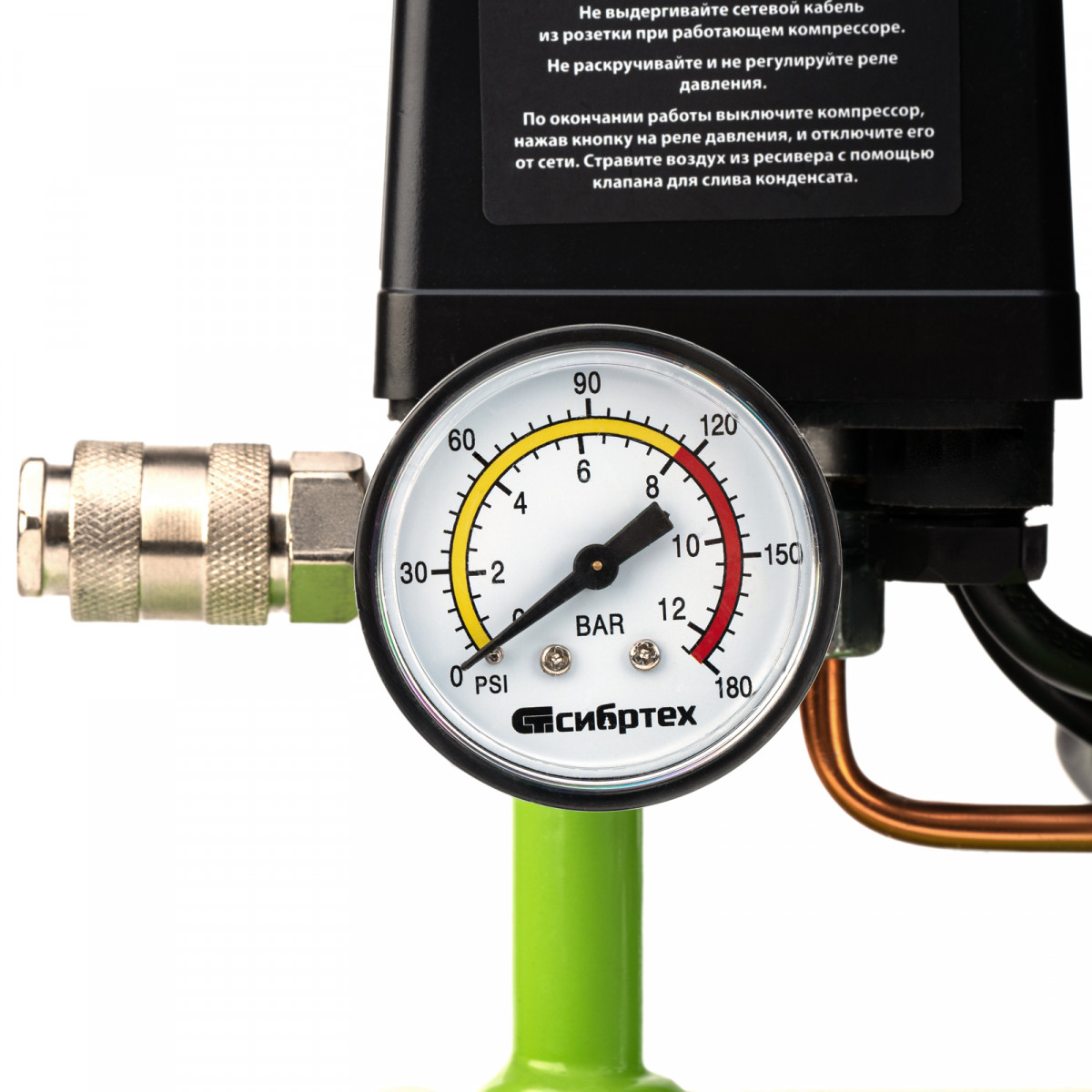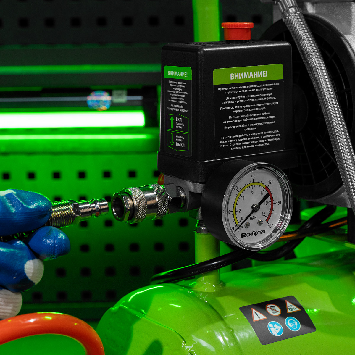 • Контроль рабочих параметров — компрессор оборудован механическим манометром для отслеживания давления.