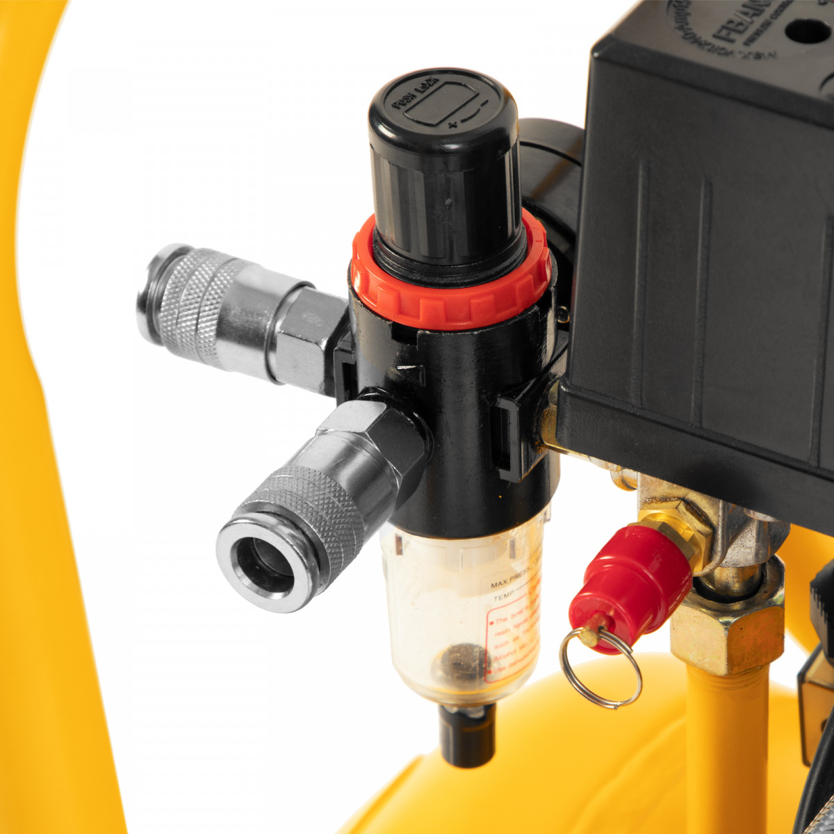 - Регулятор давления на выходе — можно выбрать оптимальный режим подачи воздуха в соответствии с характеристиками пневмоинструмента.
