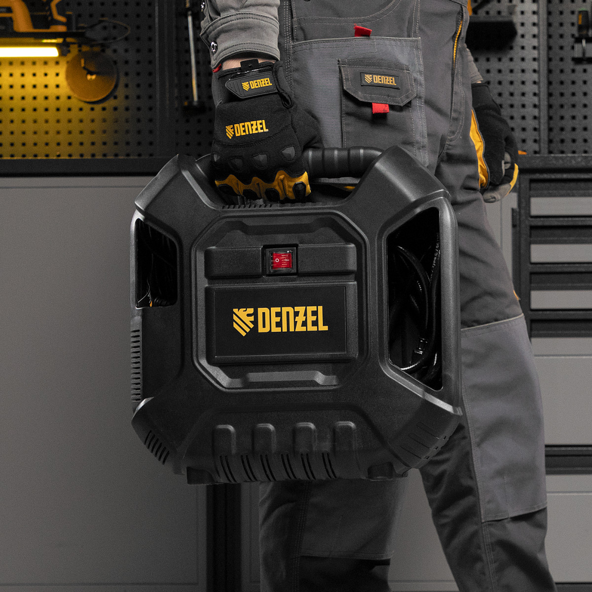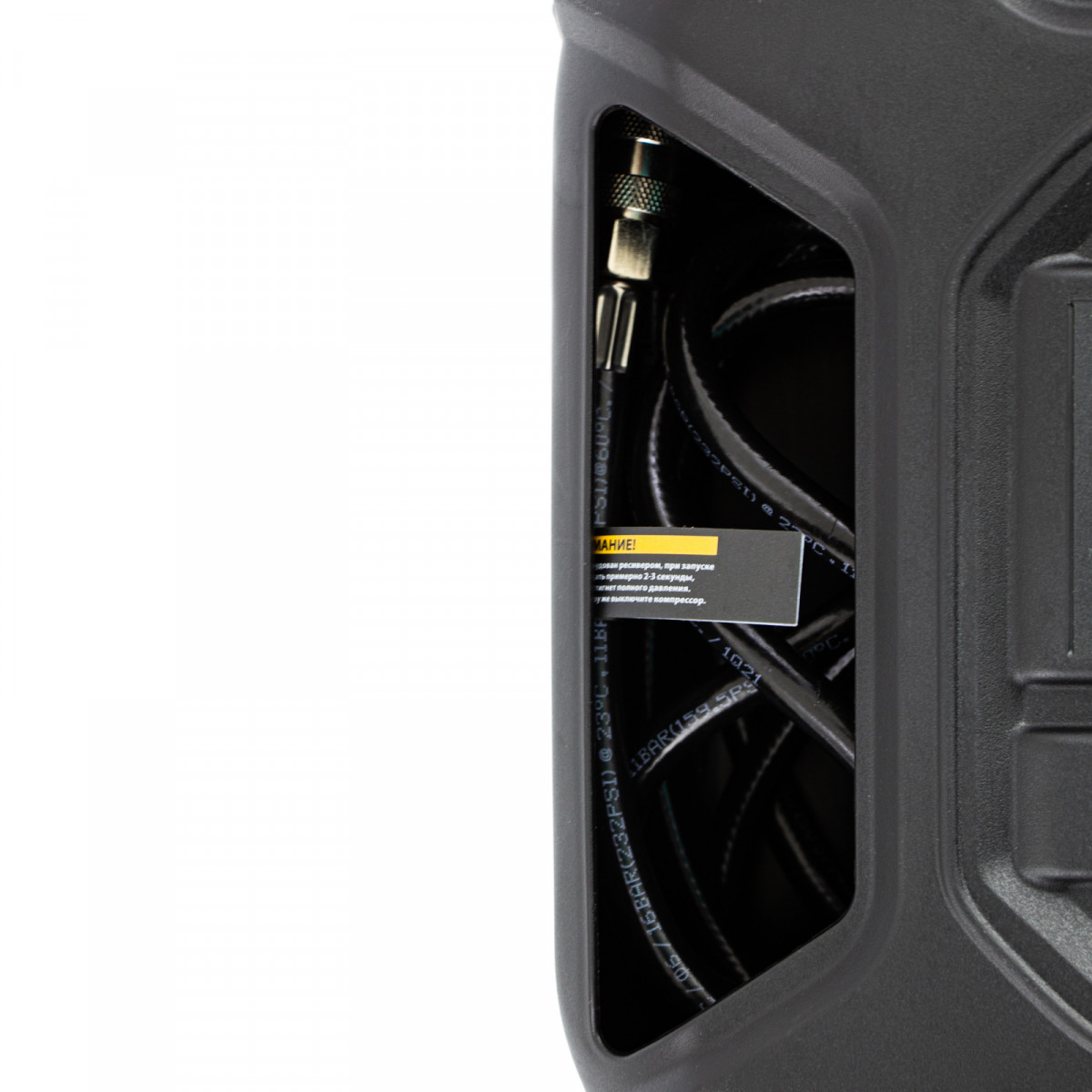 - Компактность — в компрессоре предусмотрены отсеки для кабеля питания, аксессуаров и пневмопистолета со шлангом. Такое решение позволяет аккуратно расположить комплектующие в одном месте и с удобством переносить оборудование.