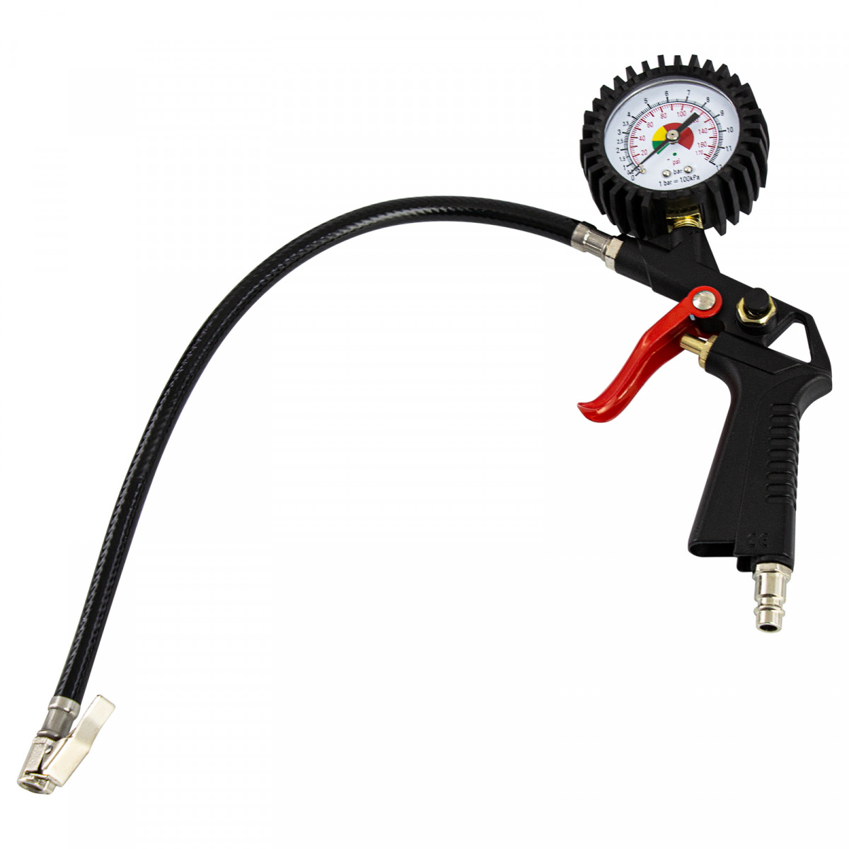 - Манометр пневмопистолета — несмотря на отсутствие ресивера, к которому обычно крепится измерительный прибор, контролировать давление сжатого воздуха можно по манометру, расположенному на корпусе пневмопистолета.