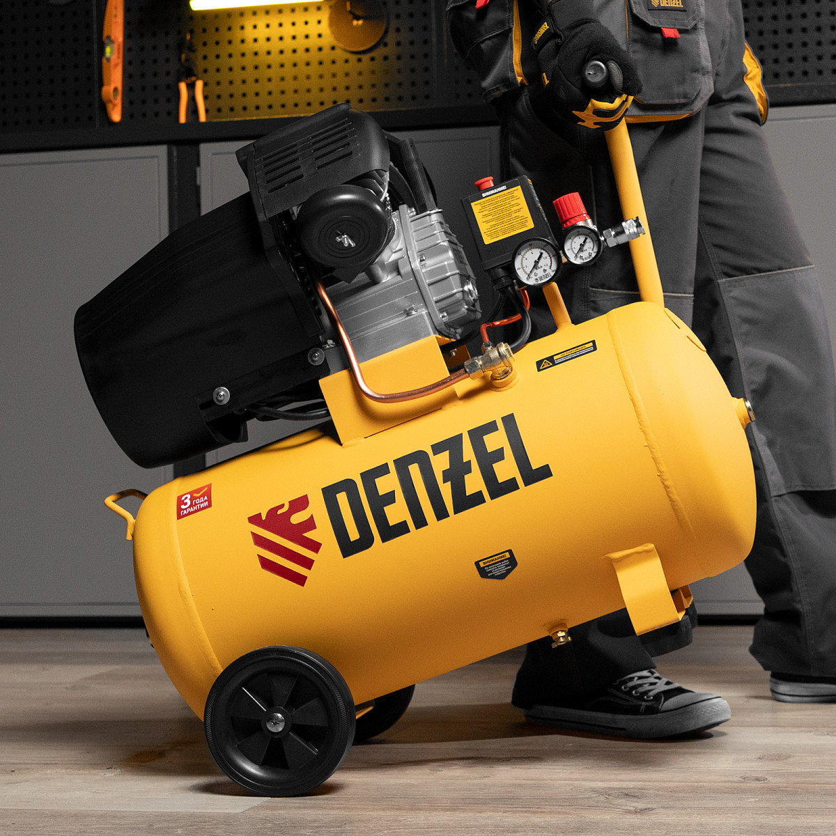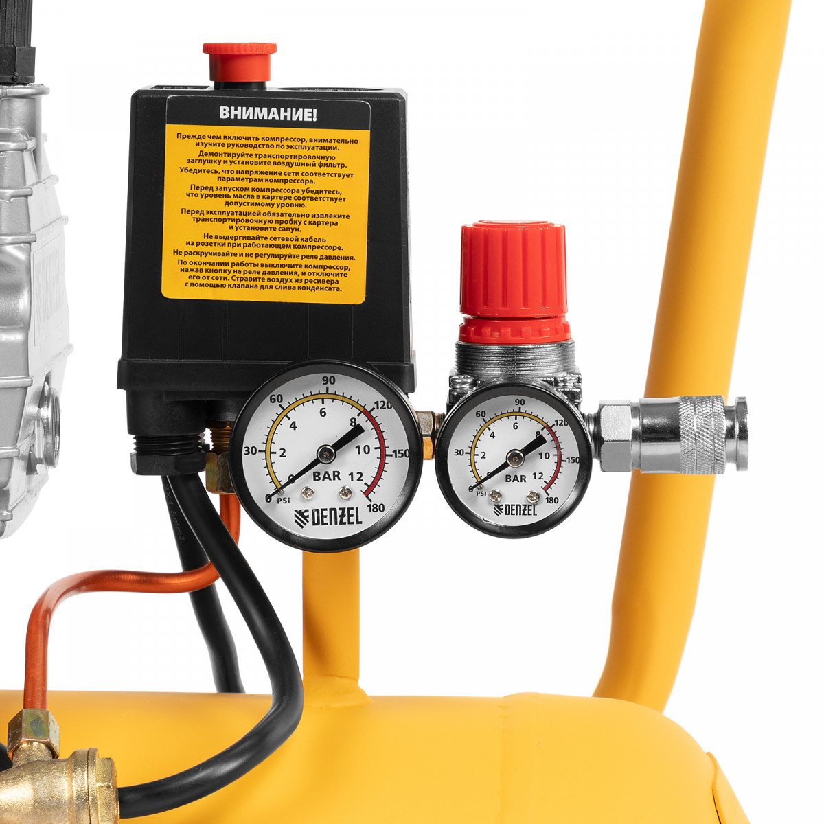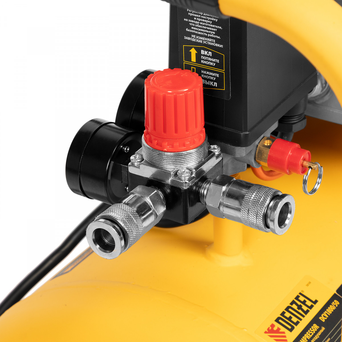 Воздушный компрессор с прямым приводом Denzel DCV1800/50 58168 мощностью 1,8 кВт и производительностью на входе 320 л/мин, с объемом ресивера 50 л, подходит для обеспечения длительной работы пневмогайковерта, пневмозубила, пневмодрели, пневмомолотка или другого пневмоинструмента. Быстроразъемные коннекторы Рапид (Евро) облегчают подключение пневмомагистралей. Эффективная система смазки снижает износ деталей и уменьшает нагрузку на двигатель, что позволяет использовать компрессор в профессиональной сфере.