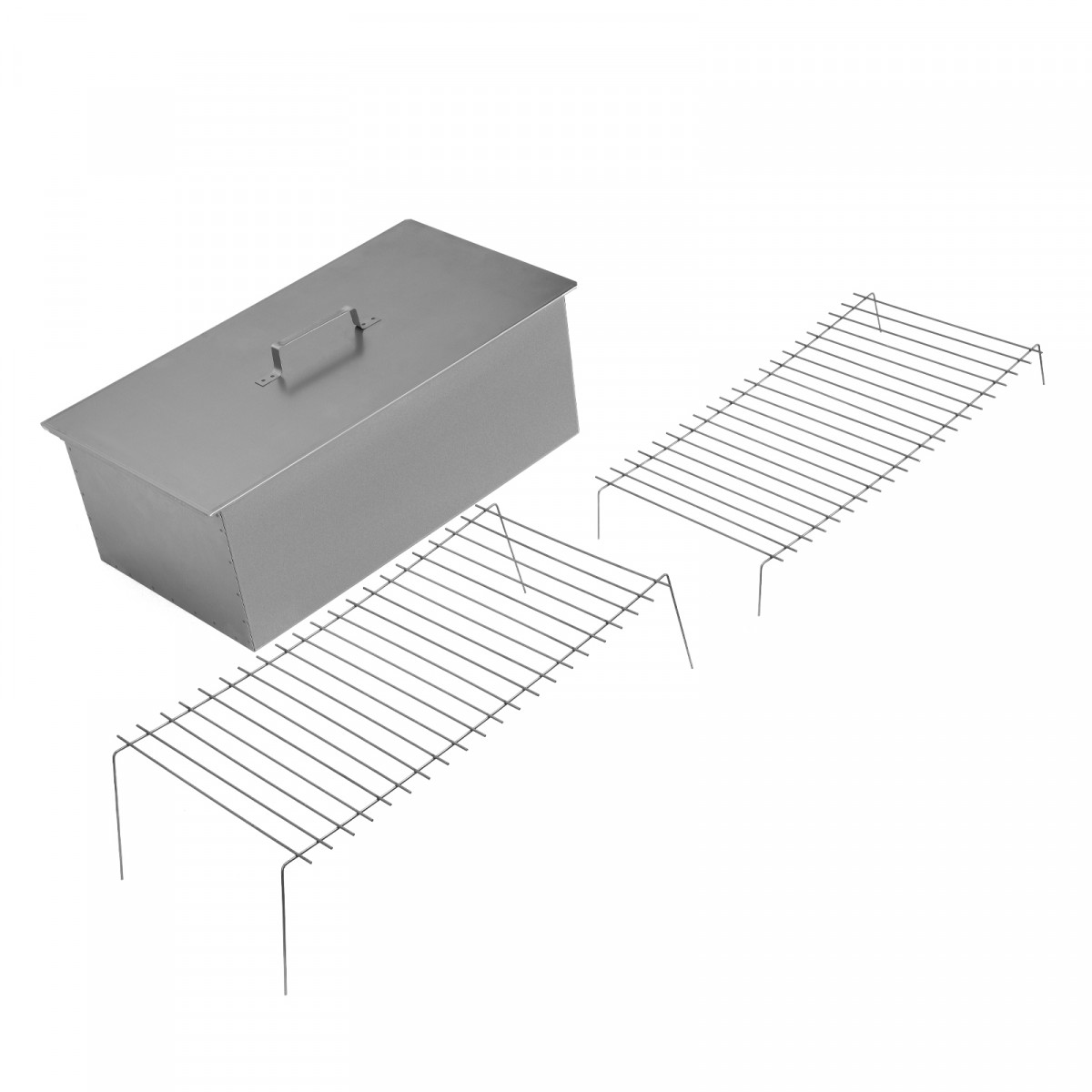 - Удобное использование — ручка не нагревается, поэтому приспособление можно снимать с огня, не опасаясь обжечься, а двухъярусная решетка позволяет за один раз приготовить в 2 раза больше еды, чем в обычной коптильне.