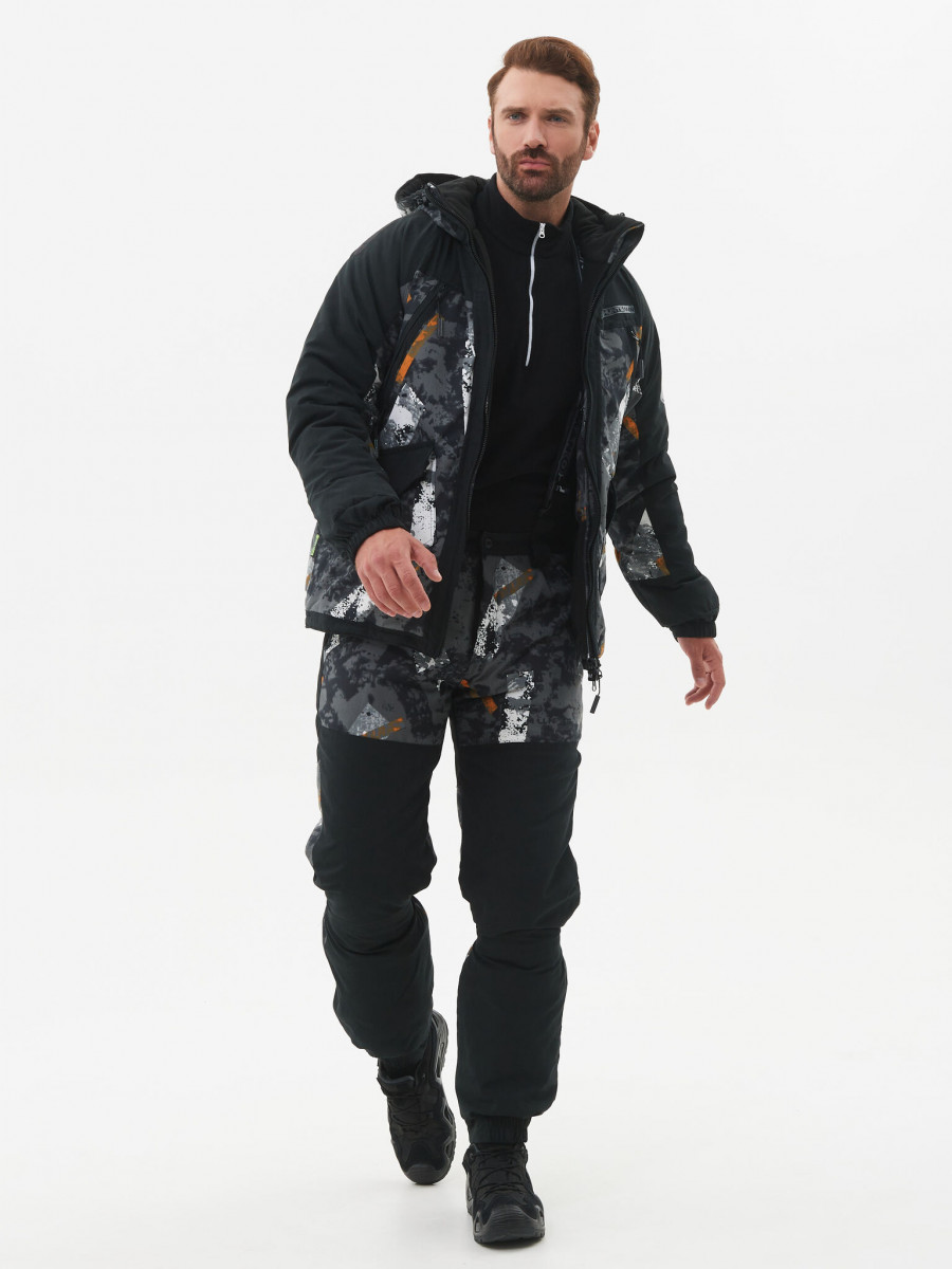 Капюшон с регулировкой; Боковые накладные карманы-«непотеряшки» с клапанами застегивающимися на бесшумную магнитную кнопку; 2 нагрудных кармана на молнии; На рукавах карманы с клапанами на металлической кнопке; Низ рукава собран на резинку; Двухзамковая молния. Полукомбинезон: Регулируемые съёмные помочи; 2 классических кармана на молнии; Складка в области колена; Внутренние гетры, для защиты от пыли.
