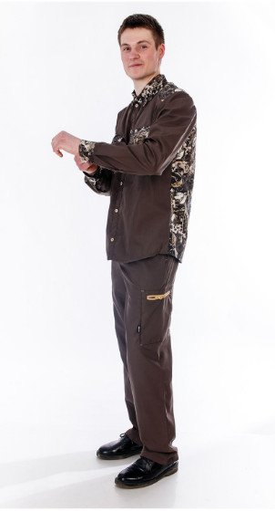 Карманы накладные с клапанами, застежка на пуговицы Воротник на стойке под глухую застежку Рукава на манжете застежка на пуговицы Брюки 4 куармана, нижние карманы объёмный на молнии Застёжка на молнию Спинка рубашки. воротник, кокетка, манжеты, клапана, планка Боковая часть верхнего кармана брюк из отделочной ткани Ткань верха: Т/С, пл. 120