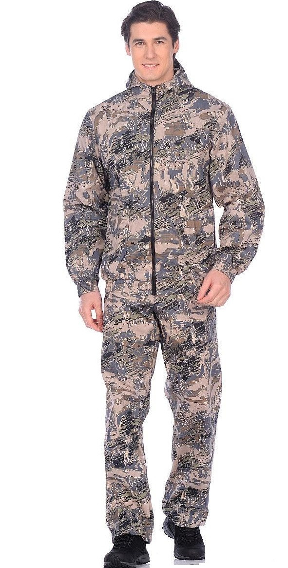 Костюм Комбат выполнен из сорочечной ткани 4-х цветной цифровой камуфляжной расцветки. Куртка на молнии имеет два накладных кармана с клапаном. Капюшон куртки регулируется по овалу лица резинкой с фиксаторами. Манжеты на рукавах, низ куртки и пояс брюк выполнены на резинке. Брюки стягиваются в поясе шнуром и имеют 2 прорезных кармана.