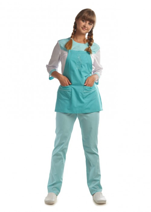 Костюм состоит из 3-х предметов: куртка, брюки, фартук.  Куртка полуприлегающего силуэта, вертикальные рельефы на полочках, округлый вырез, рукав 3/4. Рукава и верх куртки украшены контрастной отделкой. На плечевых срезах кнопки для крепления фартука. Брюки прямого кроя на резинке. Изюминка модели, это вышивка в виде повара на фартуке. Ткань смесовая 35% хлопок, 65% полиэстер, плотность 120 г/м2