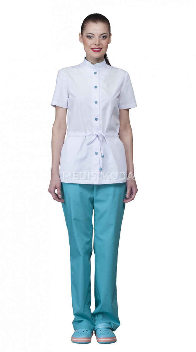 Блуза женская медицинская полуприлегающего силуэта с центральной бортовой застежкой на шести пластмассовых пуговицах. Воротник - стойка. На полочке вытачки по груди, по низу два кармана в швах со скошенным входом. По линии талии притачная планка с продернутой кулиской. Рукава втачные.