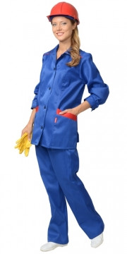 Тк. смесовая, 80% п/э, 20% х/б., пов. пл. 210 г/кв.м. Куртка длинная, с застёжкой на пуговицы, кокетками и вертик. рельефами. Брюки с боковой застёжкой. ГОСТ 27574-87.