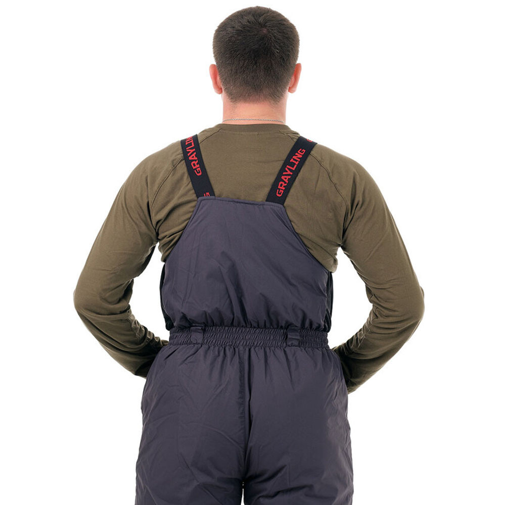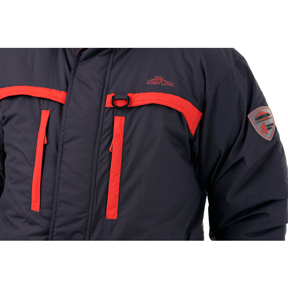 Куртка прямого силуэта удлинена по спинке, закрывается на двухзамковую молнию и ветрозащитную планку на липучках и кнопках. Нагрудные и нижние карманы с флисовым подкладом на молниях защищены листочками контрастного цвета. Внутренний карман для документов на молнии. Имеется также дополнительный карман для телефона под ветрозащитной планкой, утепленный флисом. Куртка регулируется по талии внутренней кулиской утяжкой из шляпной резинки с фиксаторами. Рукава дополнены регулируемыми неопреновыми манжетами. Высокий воротник утеплен флисовым подкладом. Съемный капюшон регулируется по высоте патой на липучке, по овалу лица – шляпной резинкой с фиксаторами. На груди имеется D-образное кольцо для подвешивания инструмента. Крупные пуллеры-кольца дают возможность расстегивать карманы не снимая перчаток. Высокие брюки-полукомбинезон регулируются по высоте эластичными бретелями. Пояс брюк на спинке собран на широкую резинку, дополнен шлевками. Застегивается комбинезон на двухзамковую молнию с планкой на липучках.