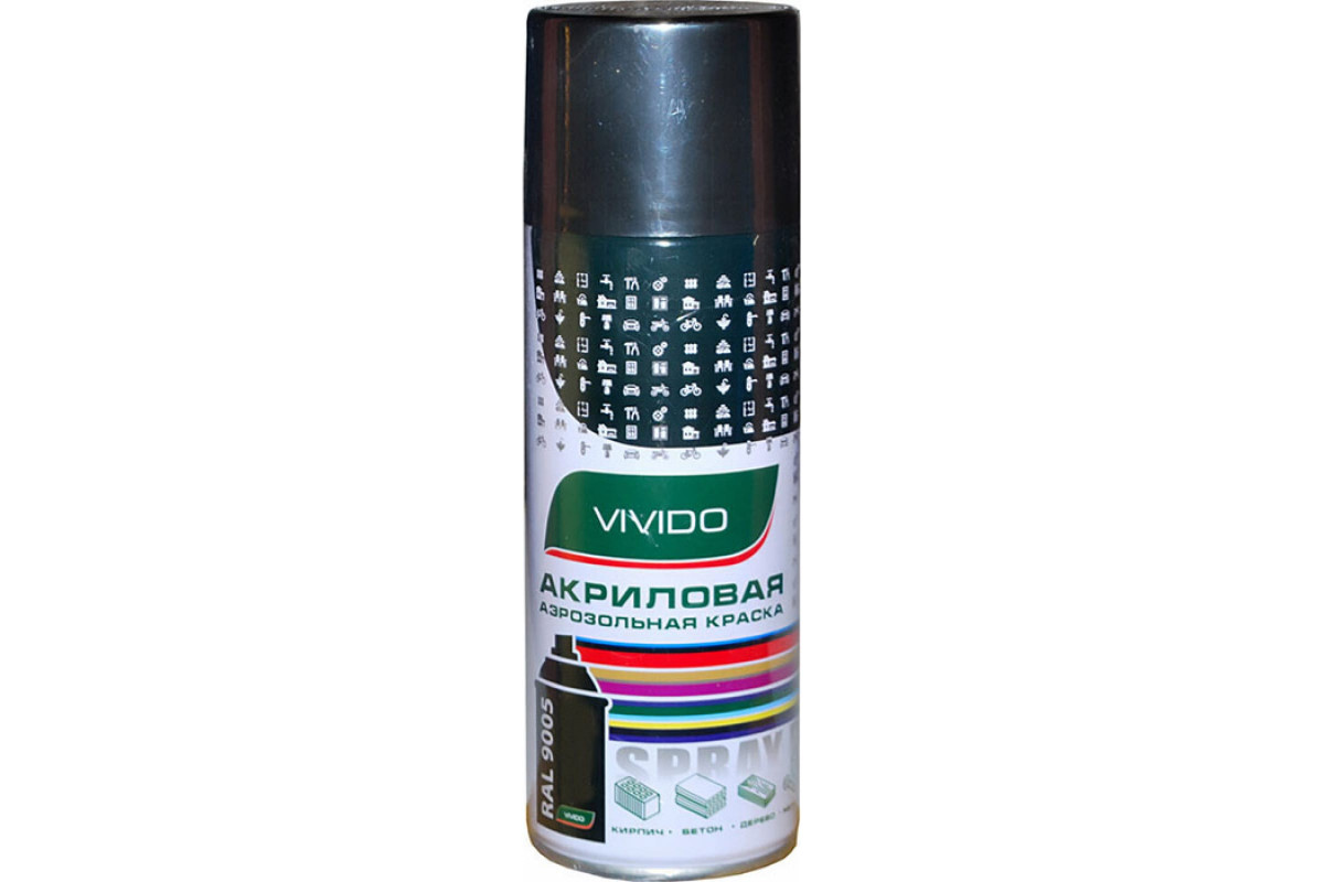 Акриловая аэрозольная краска Vivido черный матовый RAL 9005 VI9005m предназначена для высококачественного окрашивания деревянных, металлических, пластиковых, каменных, бетонных, керамических и др. поверхностей. Служит для обработки различного оборудования, приборов, мебели, оконных рам, дверей, дверных ручек, элементов сантехники, инструментов, предметов декора, изделий ручной работы, автомобилей, мотоциклов и прочего.