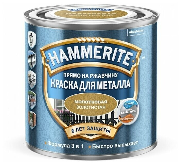 Молотковая эмаль с добавлением силикона. Прекрасно подходит для металлов, используется для дерева и различных видов пластика. С ее помощью создают износостойкое и долговечное антикоррозийное покрытие. Эмаль становится эффективной защитой от ржавчины. Молотковая эмаль Hammerite подходит как для цветных, так и черных металлов. Срок антикоррозийного эффекта составляет как минимум 8 лет.