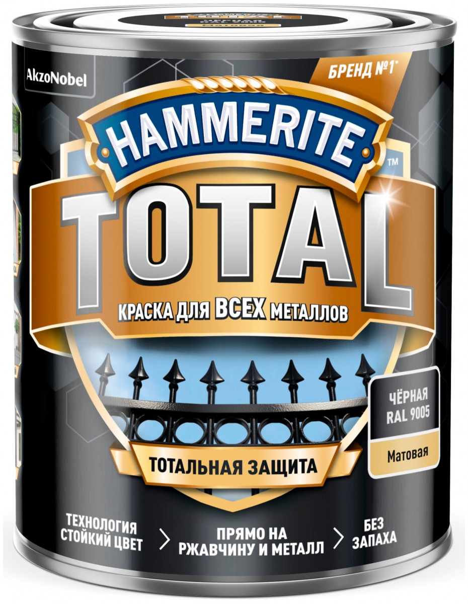 Краска Hammerite Total — гладкий матовый состав для обработки всех типов черных и цветных металлов без предварительной огрунтовки. Благодаря входящим в состав антикоррозионным добавкам и консервантам краска формирует особо прочное эластичное покрытие, устойчивое к атмосферным воздействиям. Средство предназначено для наружного использования.