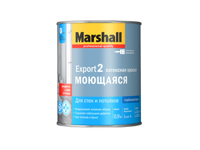 Глубокоматовая водно-дисперсионная (латексная) интерьерная краска ''Marshall Export-2'' для стен и потолков. Обладает высокой адгезией, продлевая срок службы окрашенной поверхности. Скрывает небольшие дефекты поверхности. Отличается высокой укрывистостью, что позволяет сократить расход лакокрасочного материала. Окрашенная поверхность выдерживает мытье без применения моющих средств. Тиксотропная формула: без брызг и потеков.