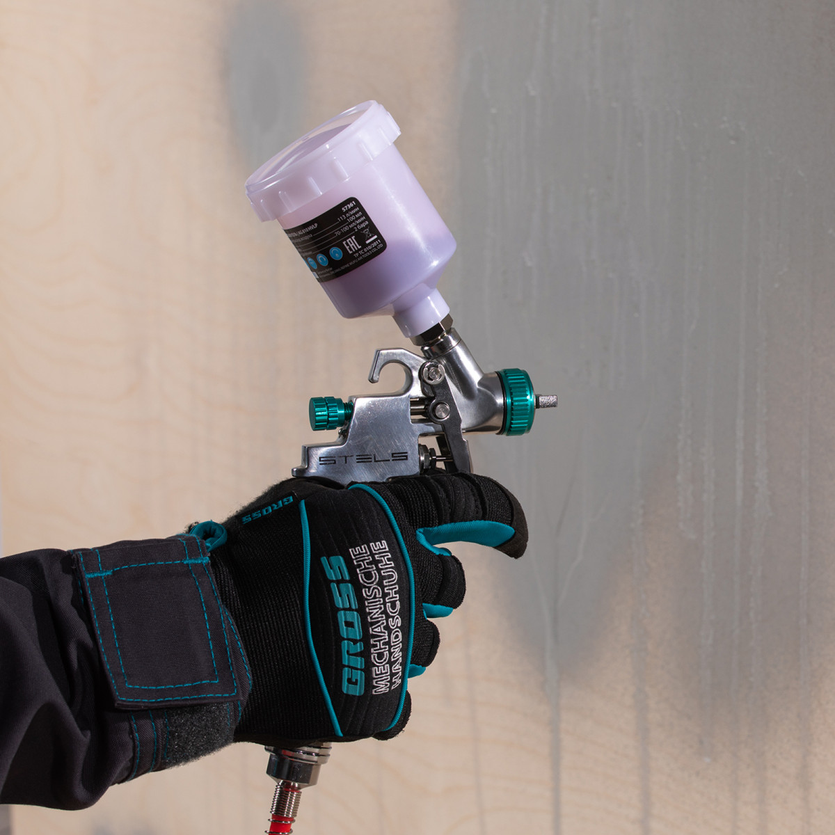 - Легкий вес 390 грамм — мастер не устанет при выполнении покрасочных работ.