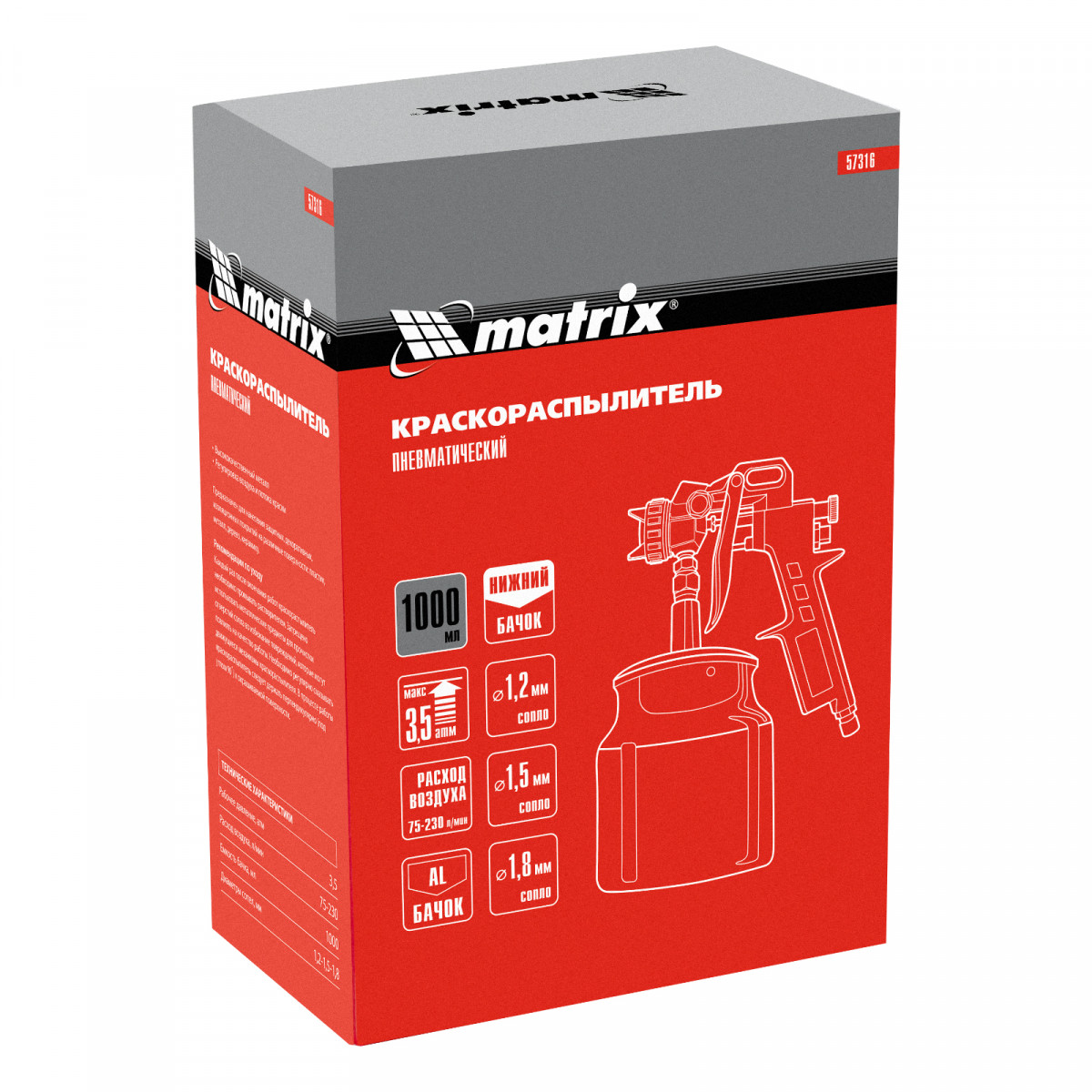 Пневматический краскораспылитель Matrix 57316 с нижним бачком объемом 1,0 л и соплами диаметром 1,2, 1,5 и 1,8 мм используется для окрашивания металлических, деревянных, керамических и пластмассовых поверхностей. Благодаря сменным соплам краскораспылитель может работать с различными по густоте составами: лаком, шпаклевкой, краской. Он пригодится на стройке, в автомастерской и на мебельном производстве.