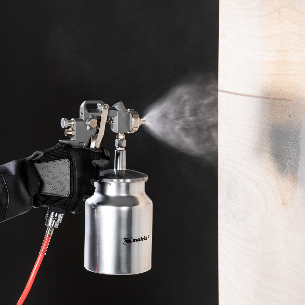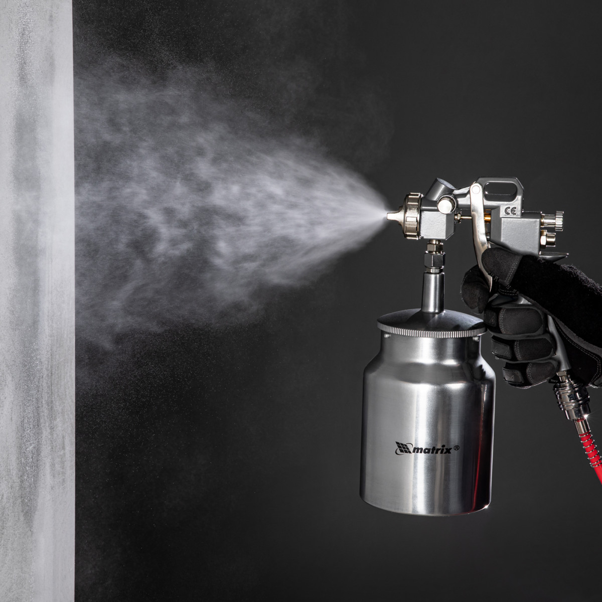 • Нижнее расположение бака — краскораспылитель можно ставить на горизонтальные поверхности, также он не загораживает обзор в процессе работы.