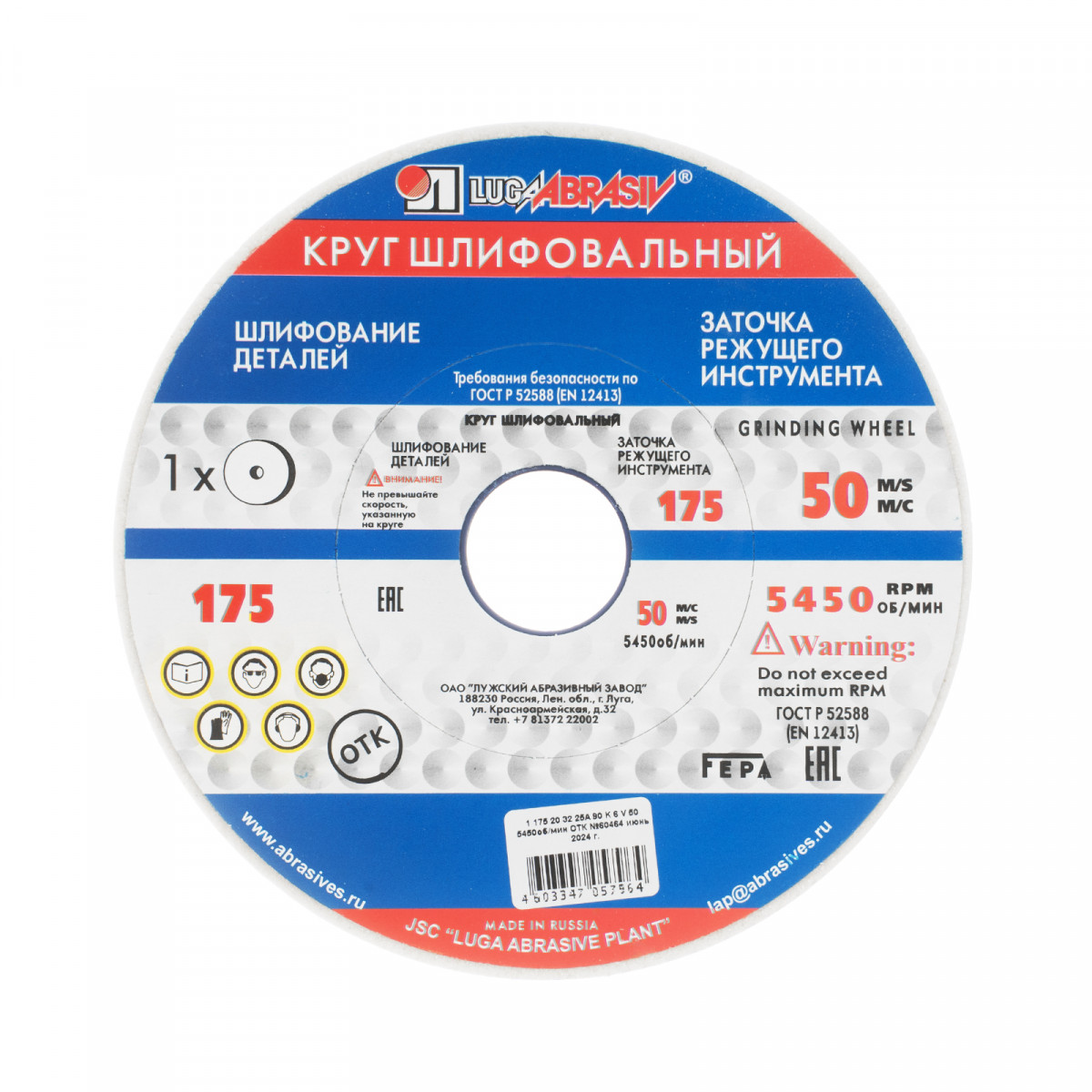 Шлифовальный круг Луга 73464, 175 х 20 х 32 мм, 25A, с зернистостью F90 и твердостью K, служит для сухого и мокрого шлифования деталей из углеродистых, нержавеющих и быстрорежущих сталей. Применяется также для заточки и доводки режущих инструментов, в том числе мелких — сверл, зубьев, резцов, ножей.