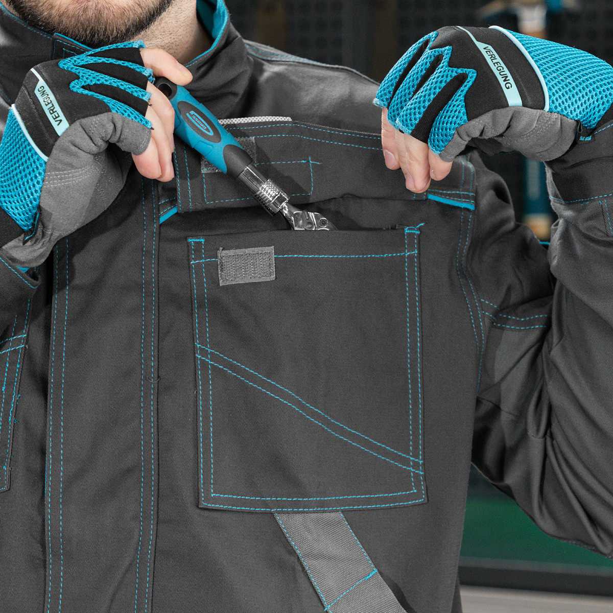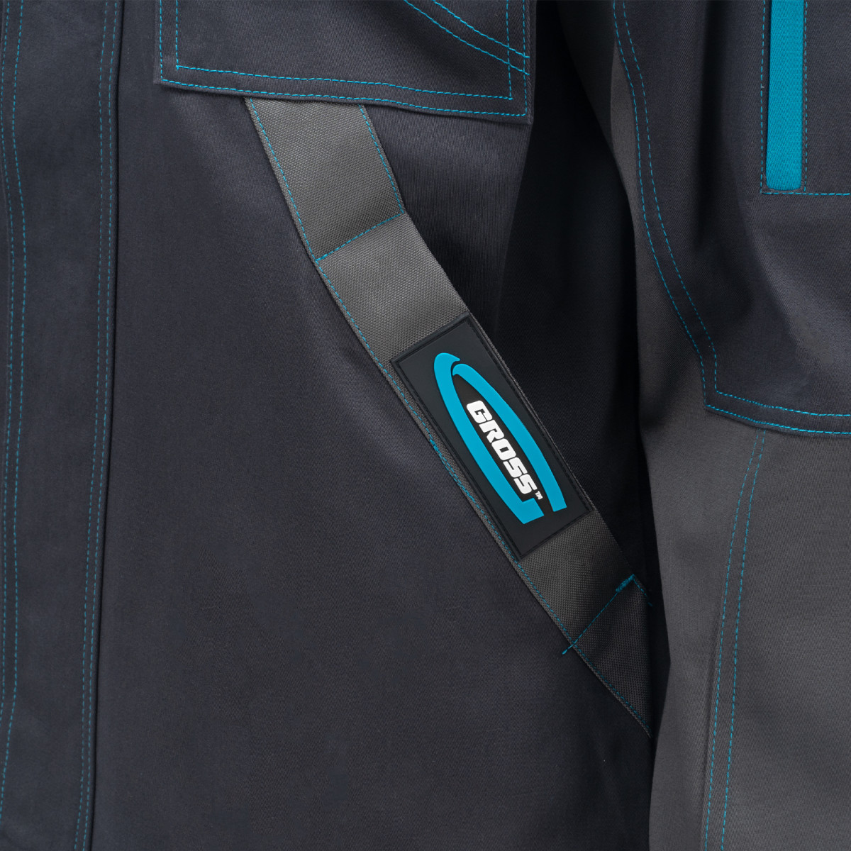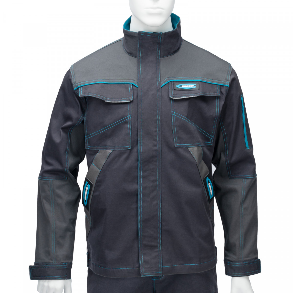 Профессиональная рабочая куртка Gross 90433 размера L защищает пользователя от общих производственных загрязнений, нетоксичной пыли, ветра и незначительных механических воздействий. Рассчитана на рост 176-182 см и предназначена для использования в теплое время года или в отапливаемом помещении. Куртка изготовлена из ткани с 97-процентным содержанием хлопка и 3-процентным содержанием спандекса. За счет наличия хлопковых волокон в составе ткань прекрасно пропускает воздух и приятна на теле, а спандекс делает ее более эластичной, поэтому в куртке удобно работать. Одежда выполнена в практичном темно-сером цвете.