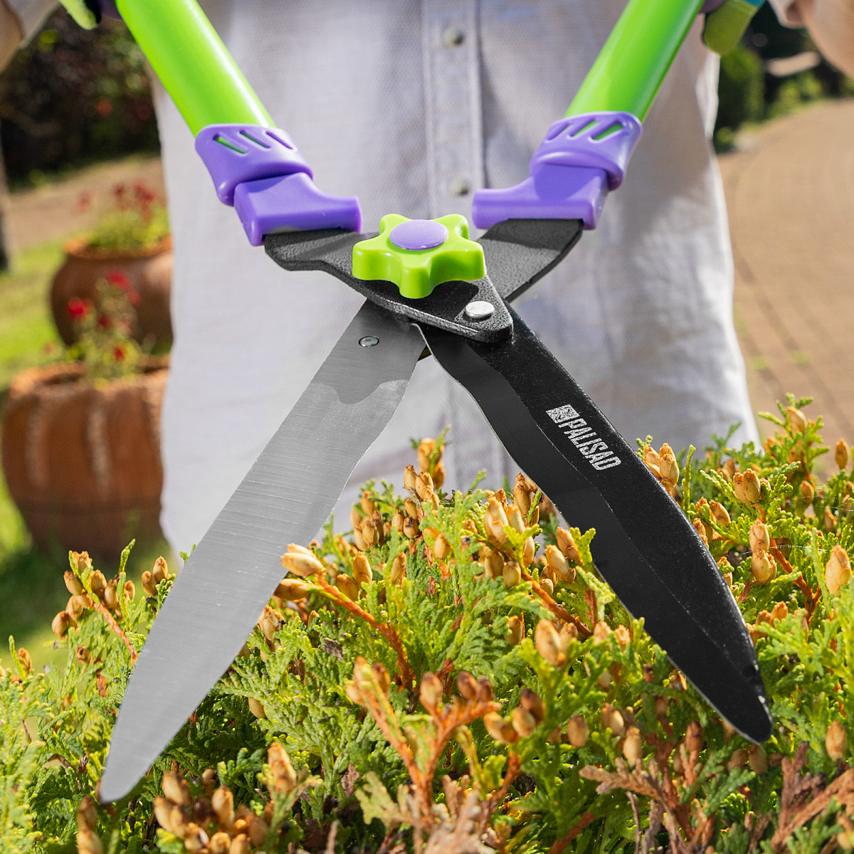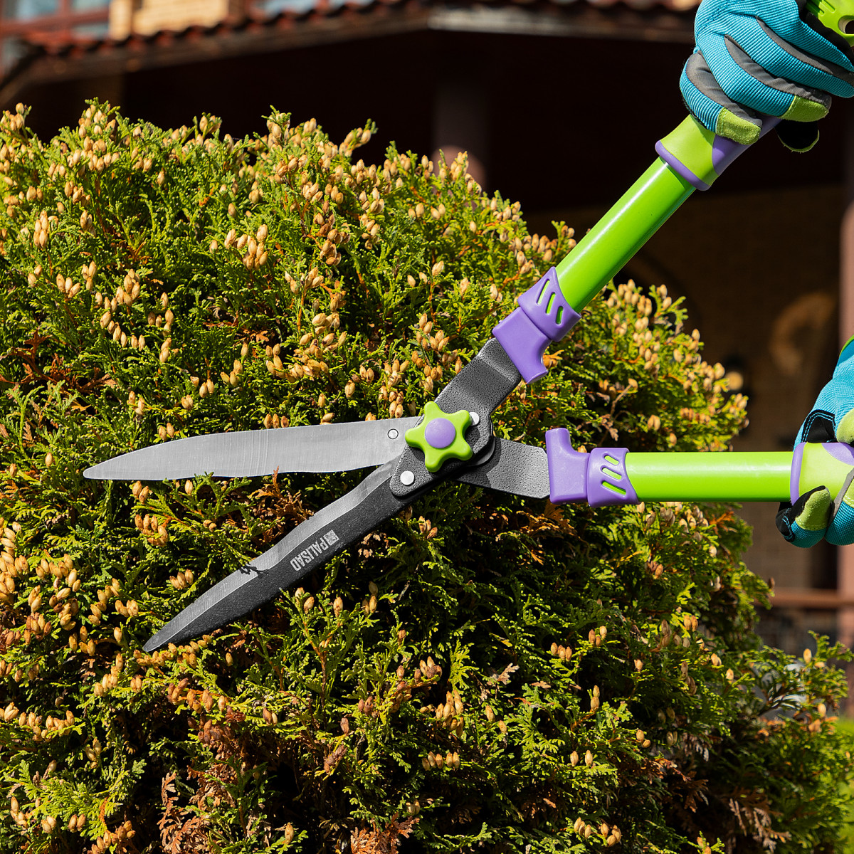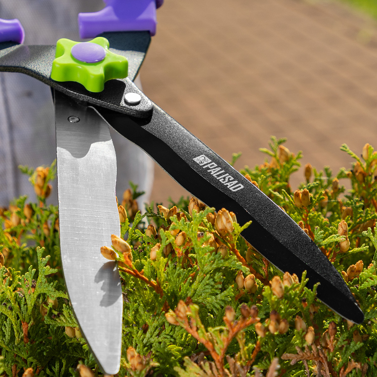 Кусторез Palisad 60836 длиной 560 мм, с волнистыми лезвиями и двухкомпонентными рукоятками, позволяет провести омолаживающую обрезку молодых побегов толщиной до 10 мм. С его помощью можно ухаживать за кустарниками и живой изгородью. Тефлоновое покрытие основного лезвия обеспечивает легкость реза. Волнистые кромки надежно удерживают ветки, поэтому инструмент подходит для подравнивания побегов с гладкой корой.