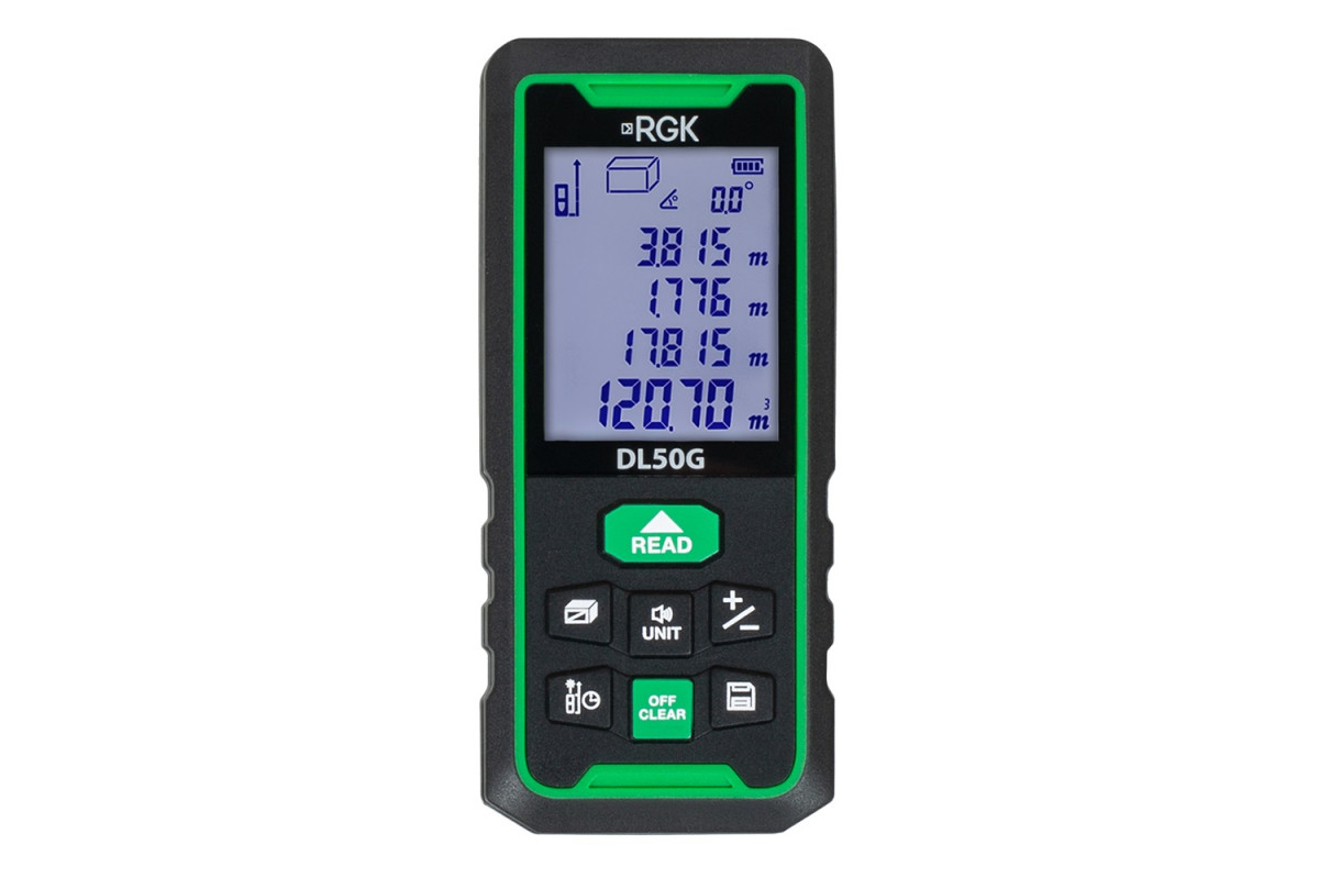 Лазерный дальномер с угломером RGK DL50G 778176 можно использовать в помещениях с большой площадью. Лазерная точка имеет зеленый цвет, который лучше воспринимается человеческим глазом, поэтому можно воспроизводить измерения без применения отражательной пластины. Предусмотрена функция таймера, которая позволяет отложить выполнение измерения на какой-то срок. Прибор имеет резьбовую втулку для закрепления на штатив. Комплектация *