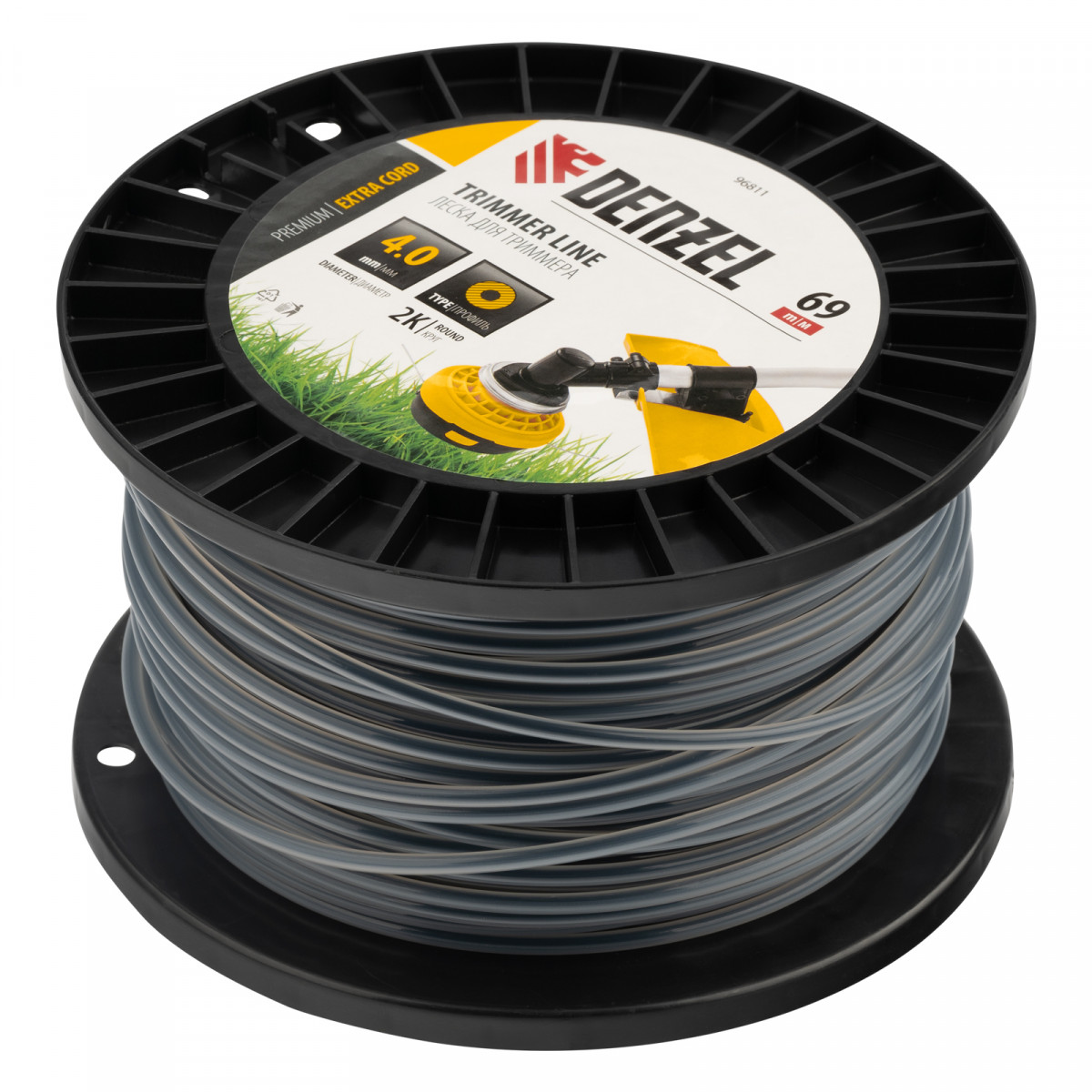 Леска для триммера двухкомпонентная круглая, 4,0мм х 69м, на DIN катушке EXTRA CORD Denzel