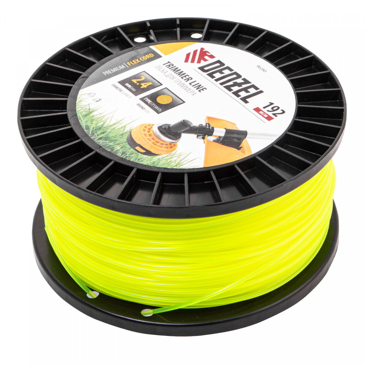 Леска для триммера Denzel FLEX CORD 96280 круглого сечения, диаметром 2,4 мм и длиной 192 м, на DIN-катушке, предназначена для скашивания как мягкой, молодой травы, так и более густой растительности. Подходит для бензиновых триммеров с объемом двигателя 25-52 см3 и электрических триммеров мощностью от 1 до 1,5 кВт.