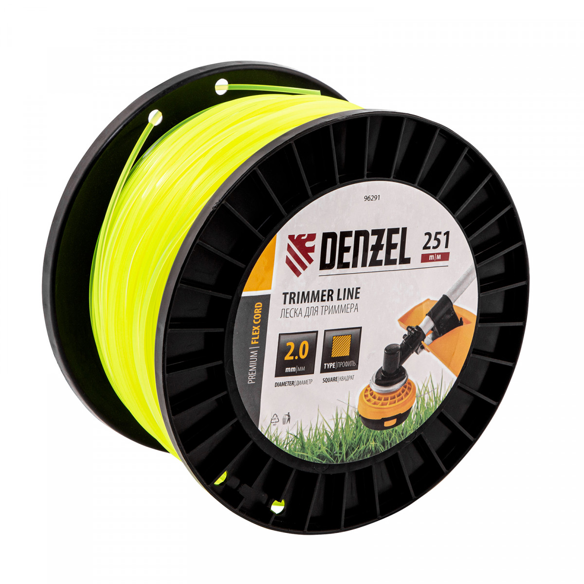 Леска для триммера Denzel FLEX CORD 96291 с сечением «квадрат», толщиной 2,0 мм и длиной 251 м, на DIN-катушке, предназначена для скашивания крупностеблевой растительности. Заправляется в катушку бензотриммеров с объемом двигателя 25-52 см3 и электротриммеров мощностью от 1 до 1,5 кВт.