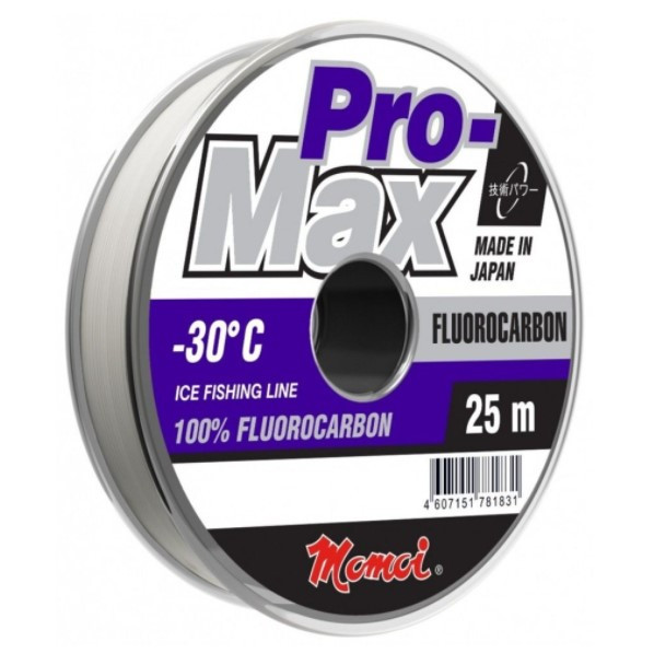 Основным плюсом в пользу лески из 100% флюорокарбона японской компании Momoi можно назвать ее невидимость в воде благодаря такому полезному качеству, как низкий коэффициент преломления солнечных лучей. С другой стороны, флюорокарбон не впитывает воду и имеет минимальную растяжимость. Эти критерии также очень важны в условиях зимней рыбалки, благодаря им леска становится более чувствительной к поклевке. Благодаря техническим характеристикам материала, флюорокарбоновая леска более тяжелая, чем обычная, поэтому она быстрее тонет и ведет себя более статично в воде. Инженеры Momoi добились того, чтобы прочностные характеристики Pro-Max Fluorocarbon были высокими и была возможность использовать леску в качестве поводков. Данная леска предназначена для зимней ловли при температуре до -30⁰С.
