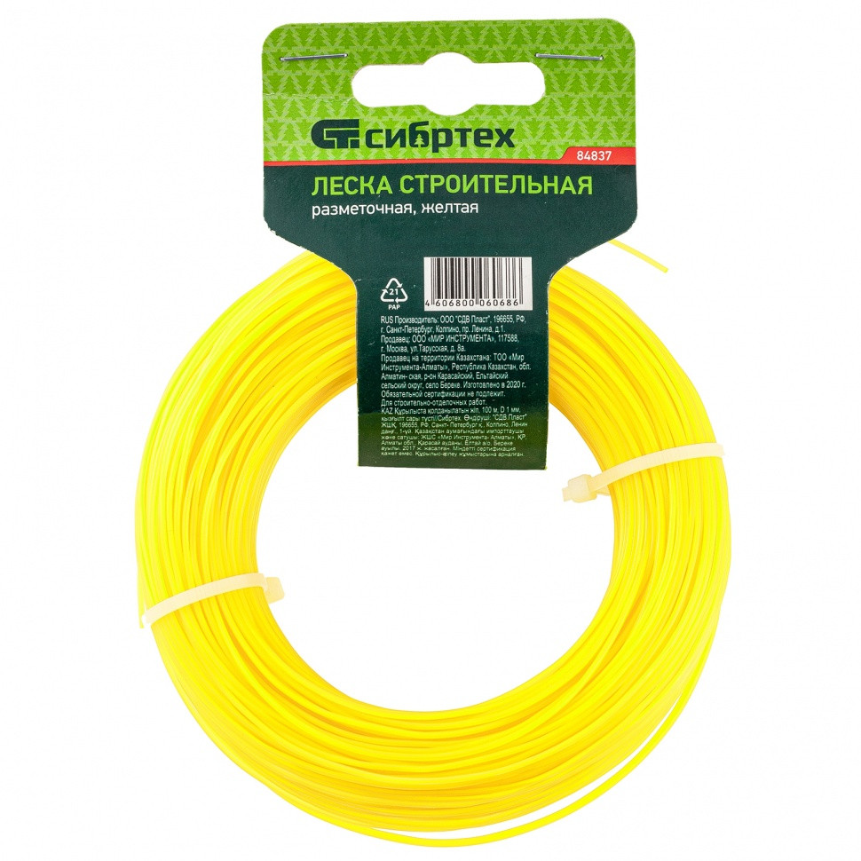 Леска строительная Сибртех 84837, длина 100 м, диаметр 1 мм, желтого цвета, пригодится на строительной площадке как ориентир при укладке материалов, установке конструкций. Также она будет полезна для садоводов для разметки территории. Если леску натянуть, то получается идеально ровная линия, что повышает точность работы, а также позволяет проводить замеры с ее помощью.Преимущества: - Леска выполнена из высокопрочного и эластичного полипропилена, поэтому не растягивается, не загрязняется, а также выдерживает разрывные нагрузки до 15 КГС. - Желтая светоотражающая леска хорошо видна даже в темное время суток. - 100 м лески хватит на большой объем работ.