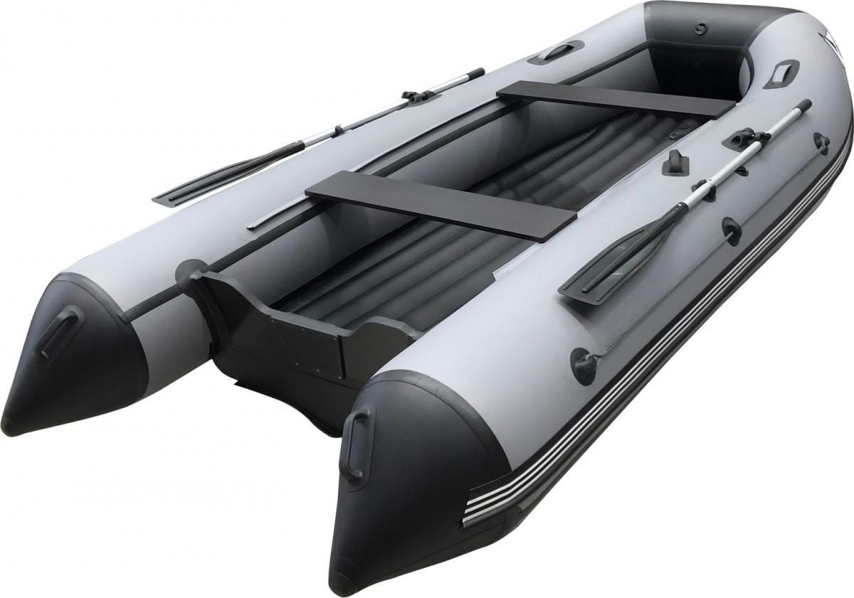 Жёсткость днища при надувании достигается не из-за давления, а благодаря установленным вертикально и продольно внутри дна переборкам, изготовленным из ткани с нулевым остаточным удлинением. Сегодня это оптимальный вариант из надувных полов. Для усиления стойкости дна к повреждениям на нижней части его приклеиваются специальные накладки.