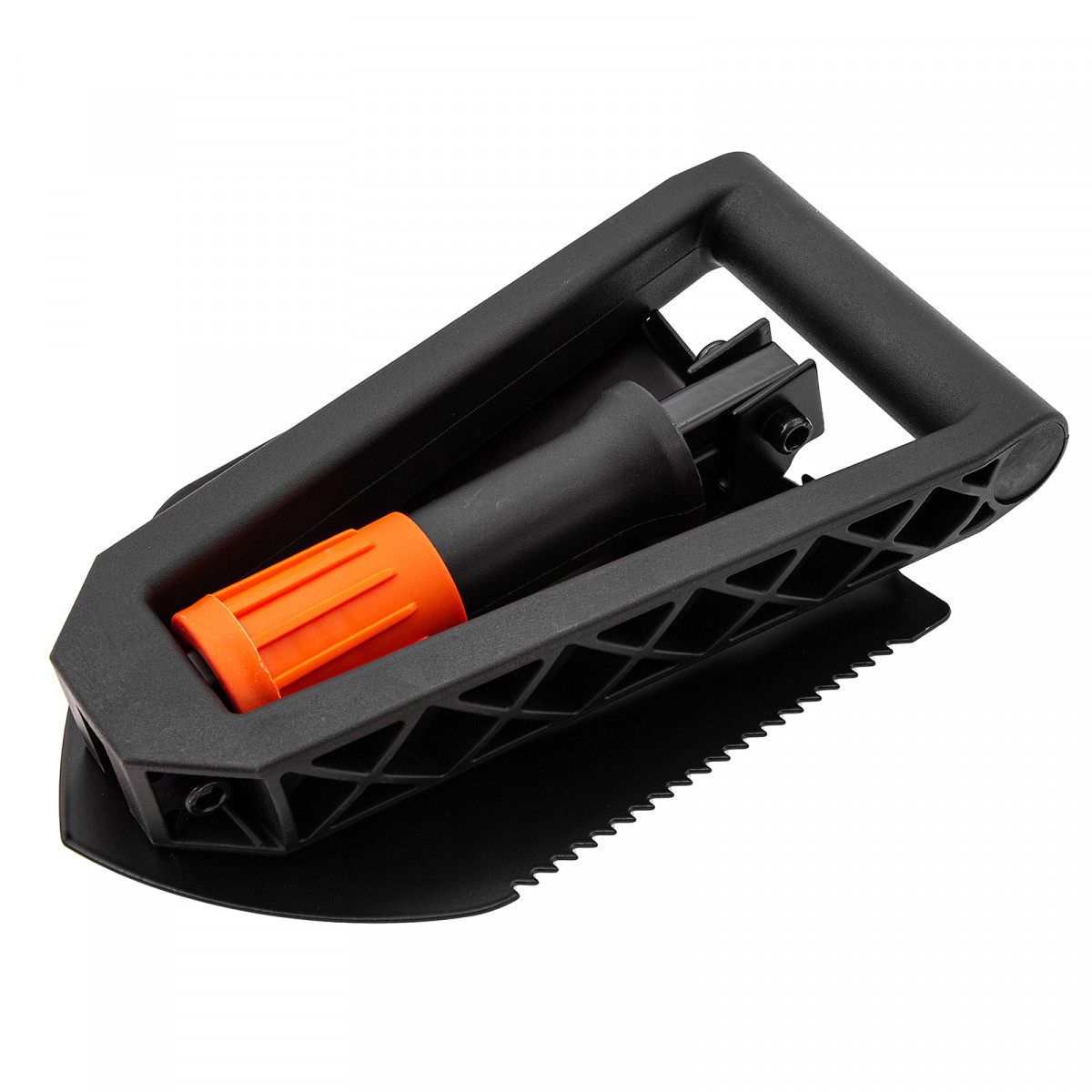 - Компактность — лопату удобно размещать как в багажнике авто, так и в походном рюкзаке, т.к. ее вес составляет 770 г, а длина в сложенном виде — 253 мм.