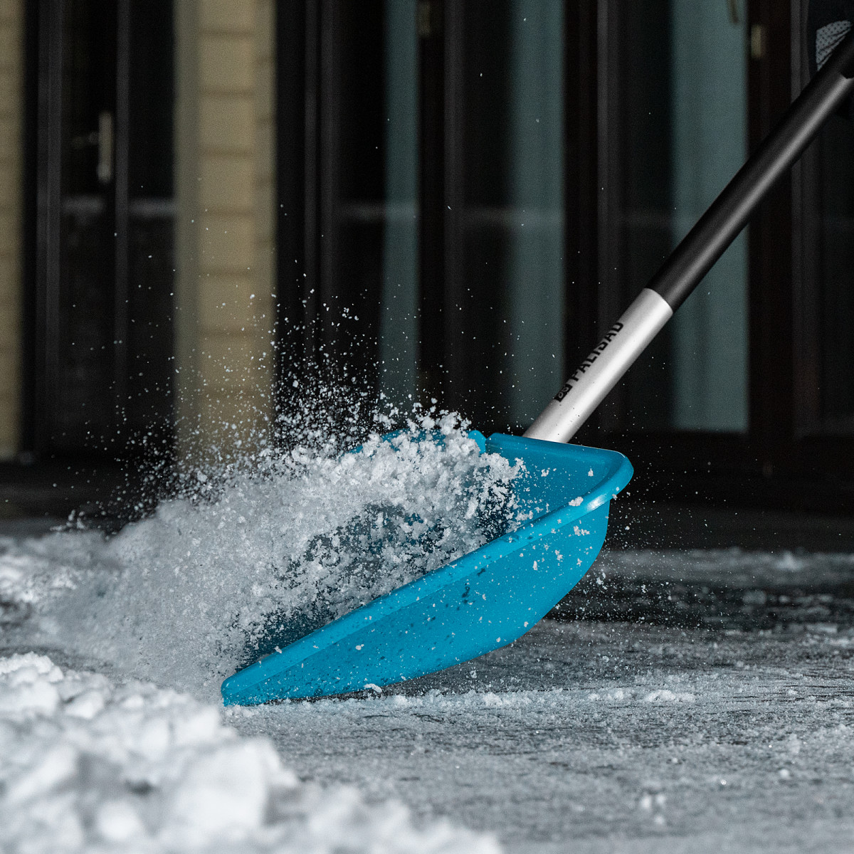 Лопата-скрепер Palisad LUXE 61727 размером 550 x 340 x 1450 мм, с ковшом из полипропилена и алюминиевым черенком с ПВХ-накладкой, предназначена для уборки снега. Широкий ковш с бортиками вмещает большое количество снега. Лопата позволяет расчистить садовую дорожку, тротуар, площадку перед гаражом и т.д.
