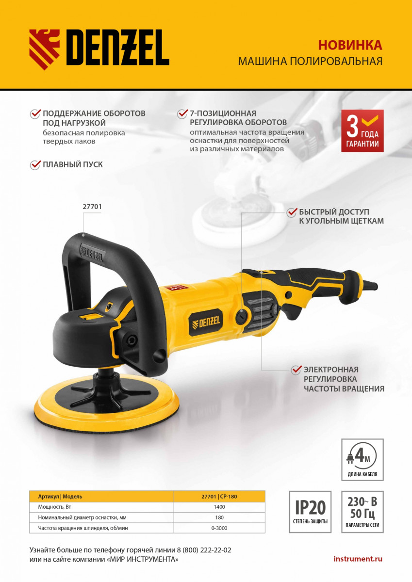 Машина полировальная CP-180, 1400 Вт, 180 мм, 0-3000 об/мин Denzel