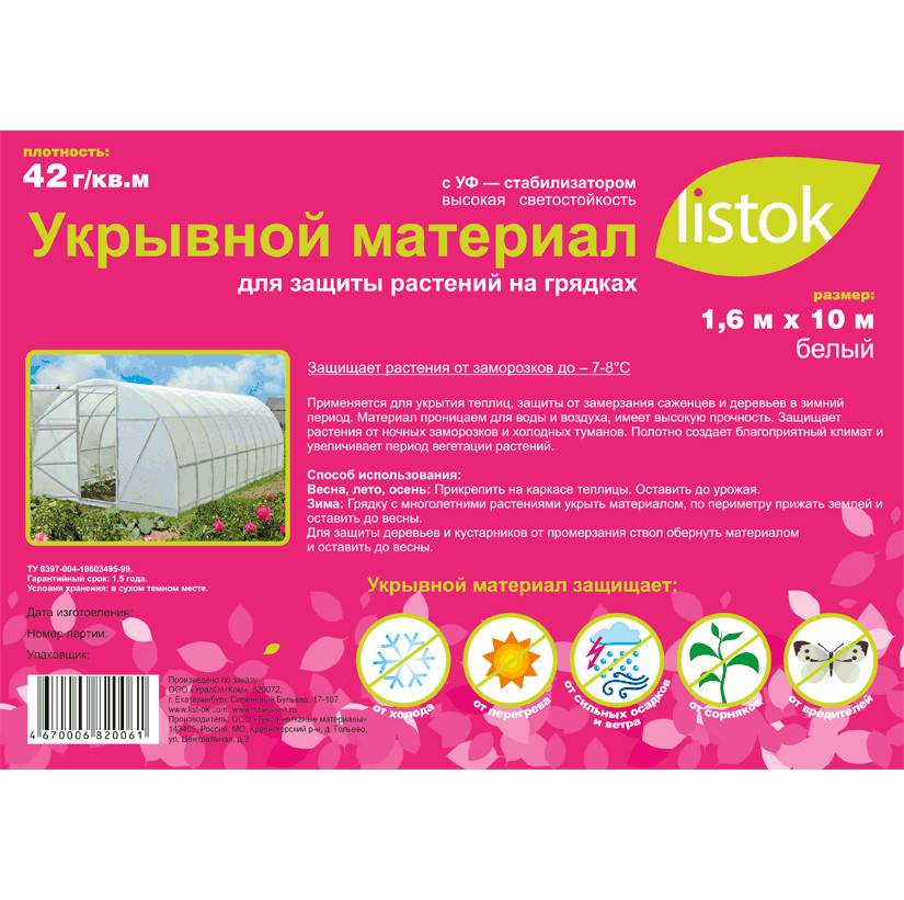Материал укрывной LISTOK суф-42 1,6*10м/20 белый