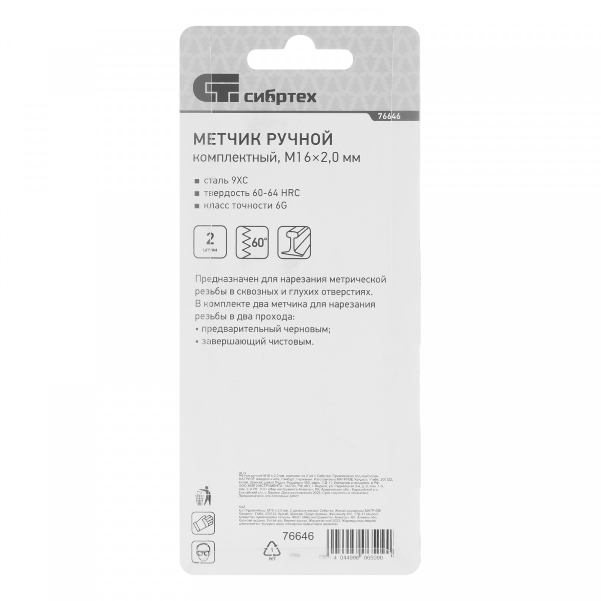 Метчик ручной М16 х 2 мм, комплект из 2 шт Сибртех