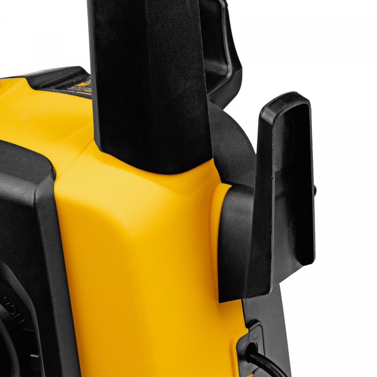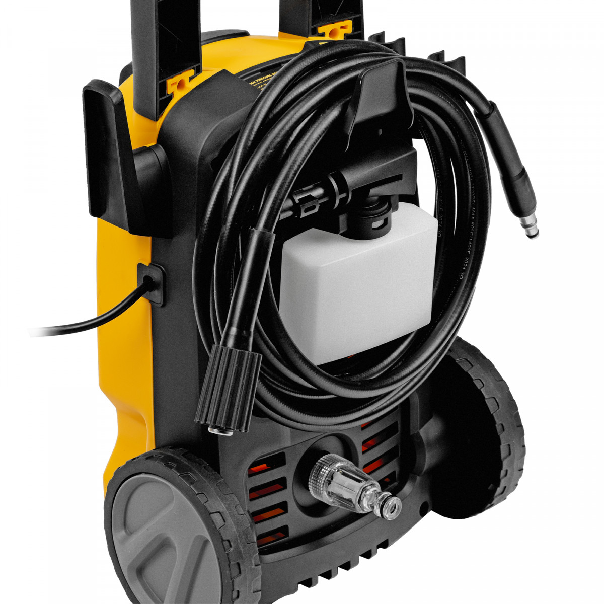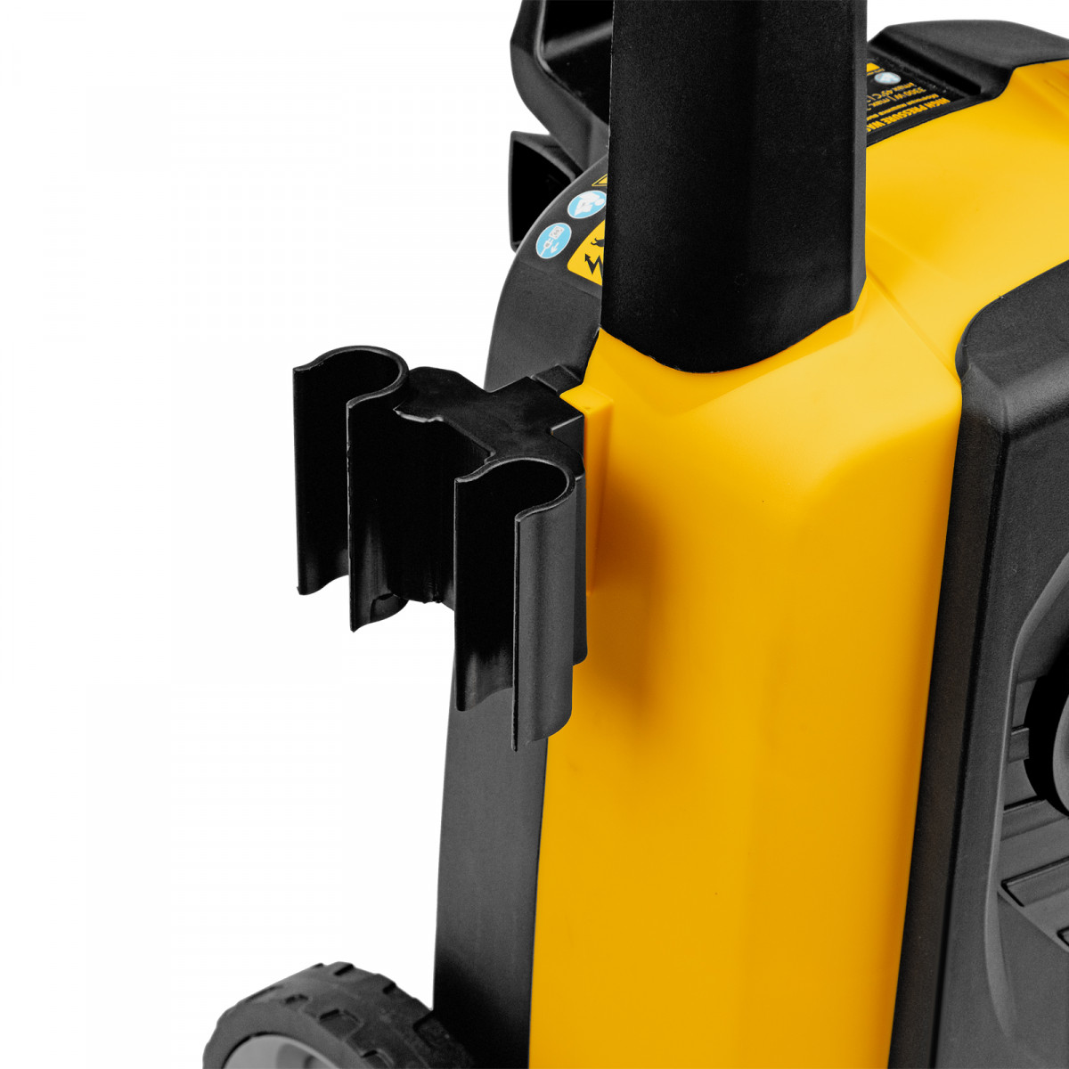 - Продуманная конструкция — кронштейны для шнура питания и шланга высокого давления, а также держатель для пистолета обеспечивают удобство хранения.