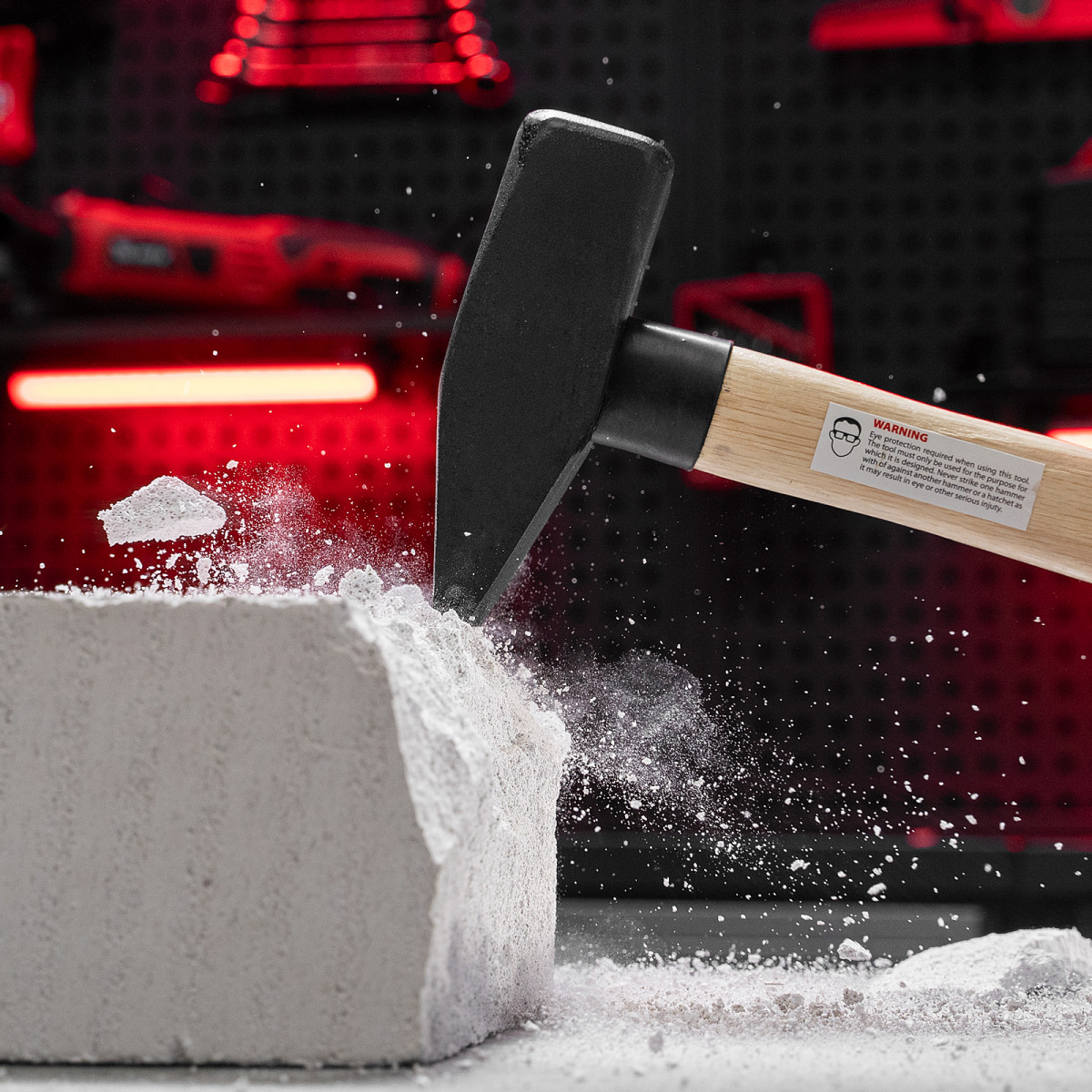 - Надежная конструкция — рукоятка расклинена, головка дополнительно зафиксирована эпоксидным клеем, увеличенная «юбка» в месте всада защищает рукоятку в случае промаха при ударе.
