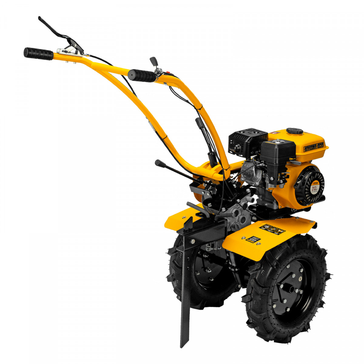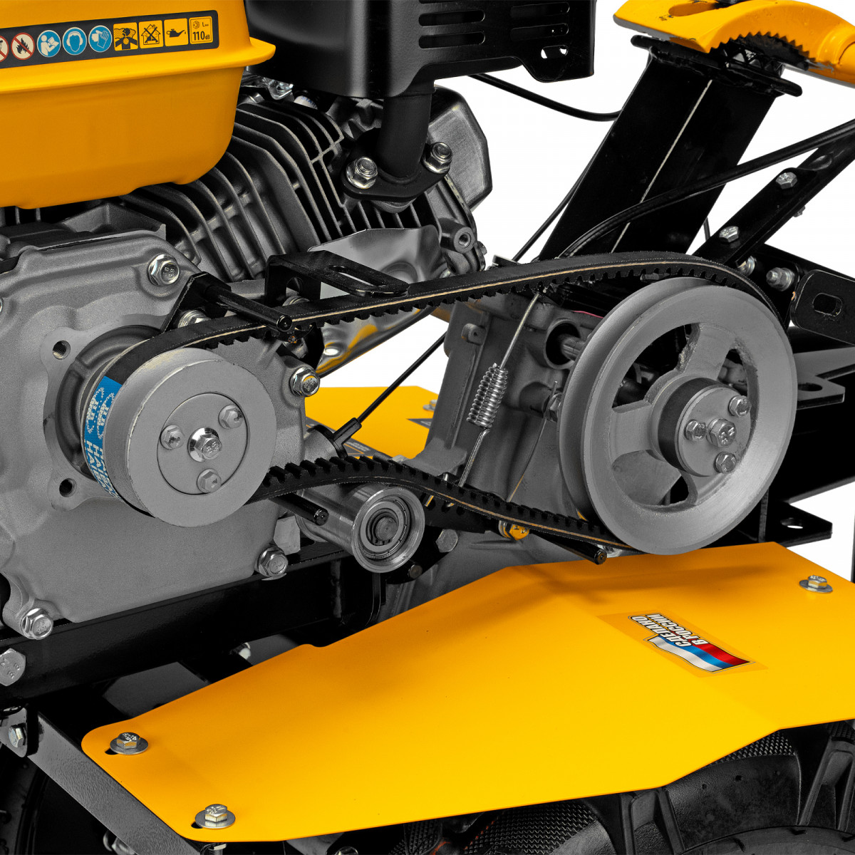 - Эффективная работа — благодаря усиленному шестеренчато-цепному редуктору с алюминиевым корпусом мотоблок успешно справляется даже с плотным, глинистым грунтом.